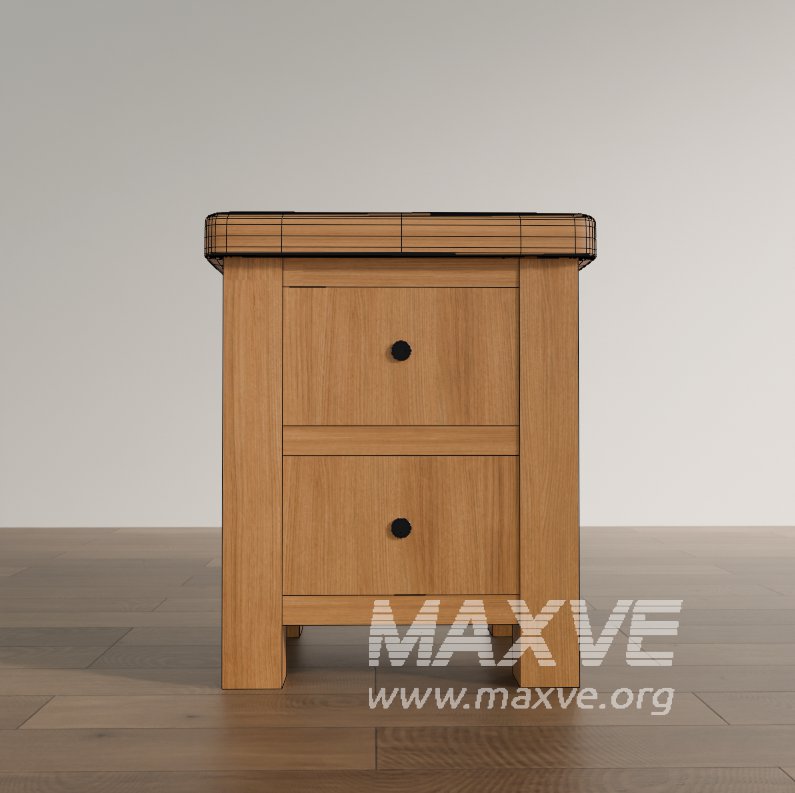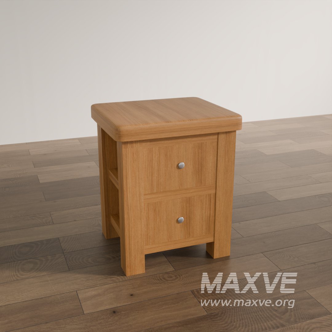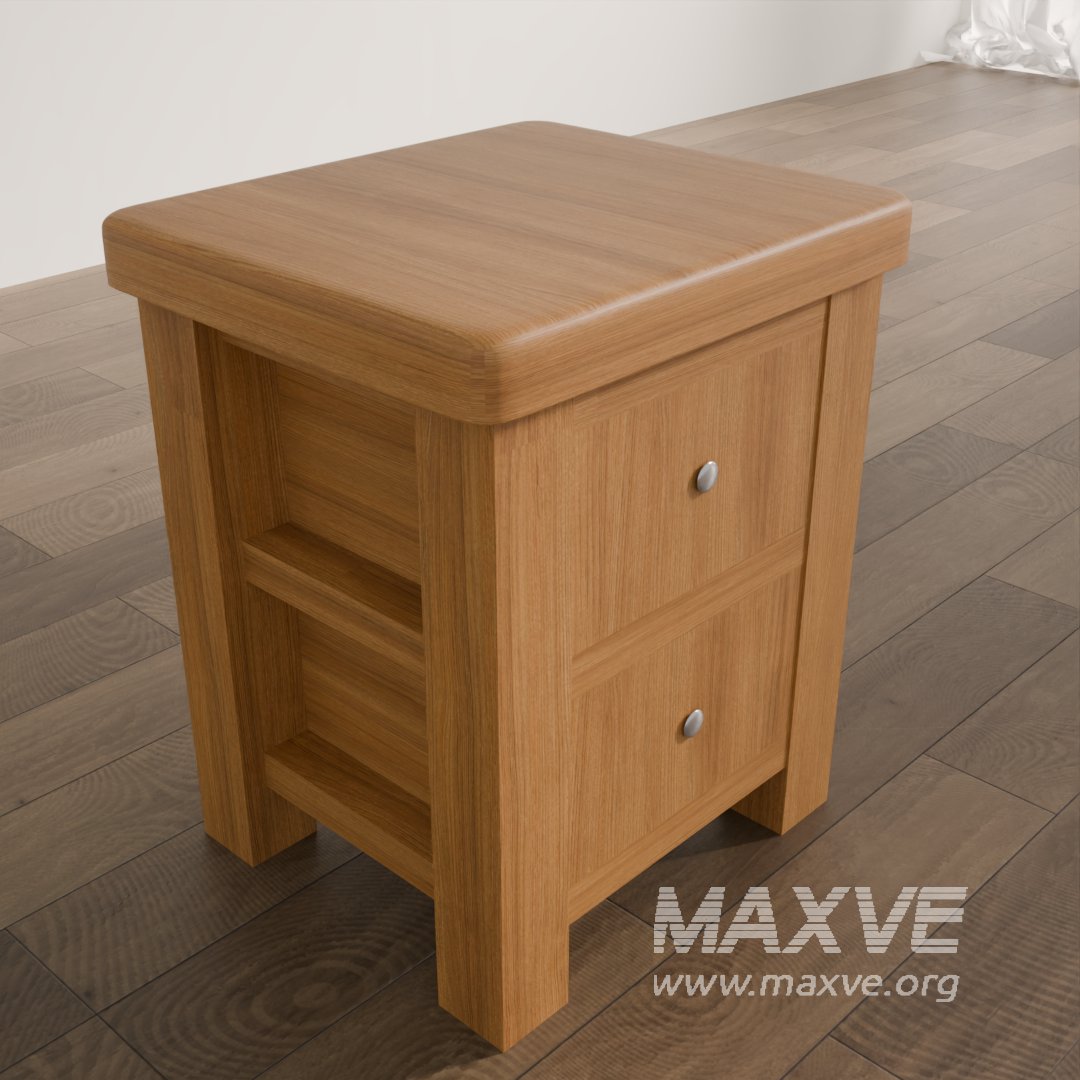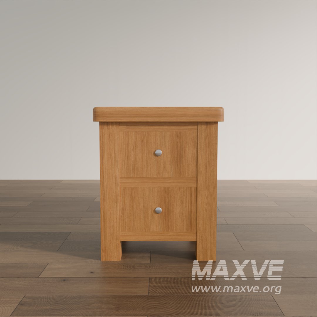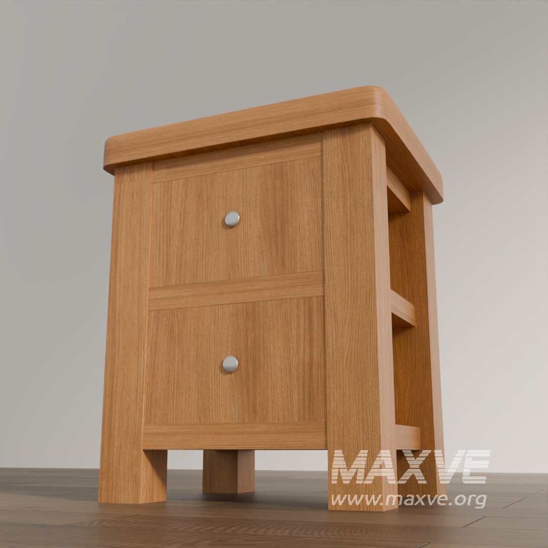 This 3D model presents a classic-style nightstand with two drawers, finished in natural wood tones and designed with elegant rounded edges and paneling. The sturdy construction and warm aesthetic make it perfect for traditional, rustic, or transitional bedroom interior visualizations.