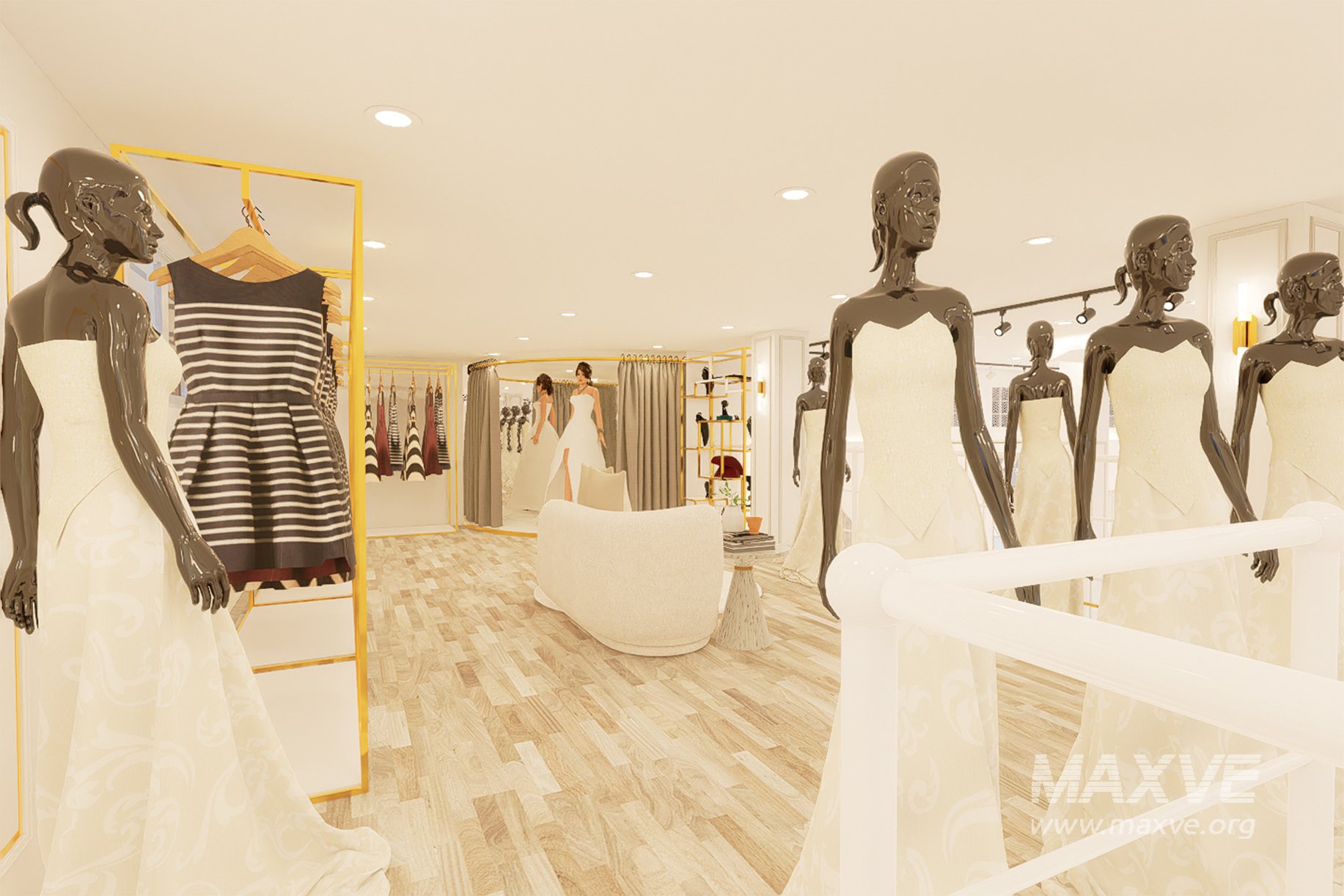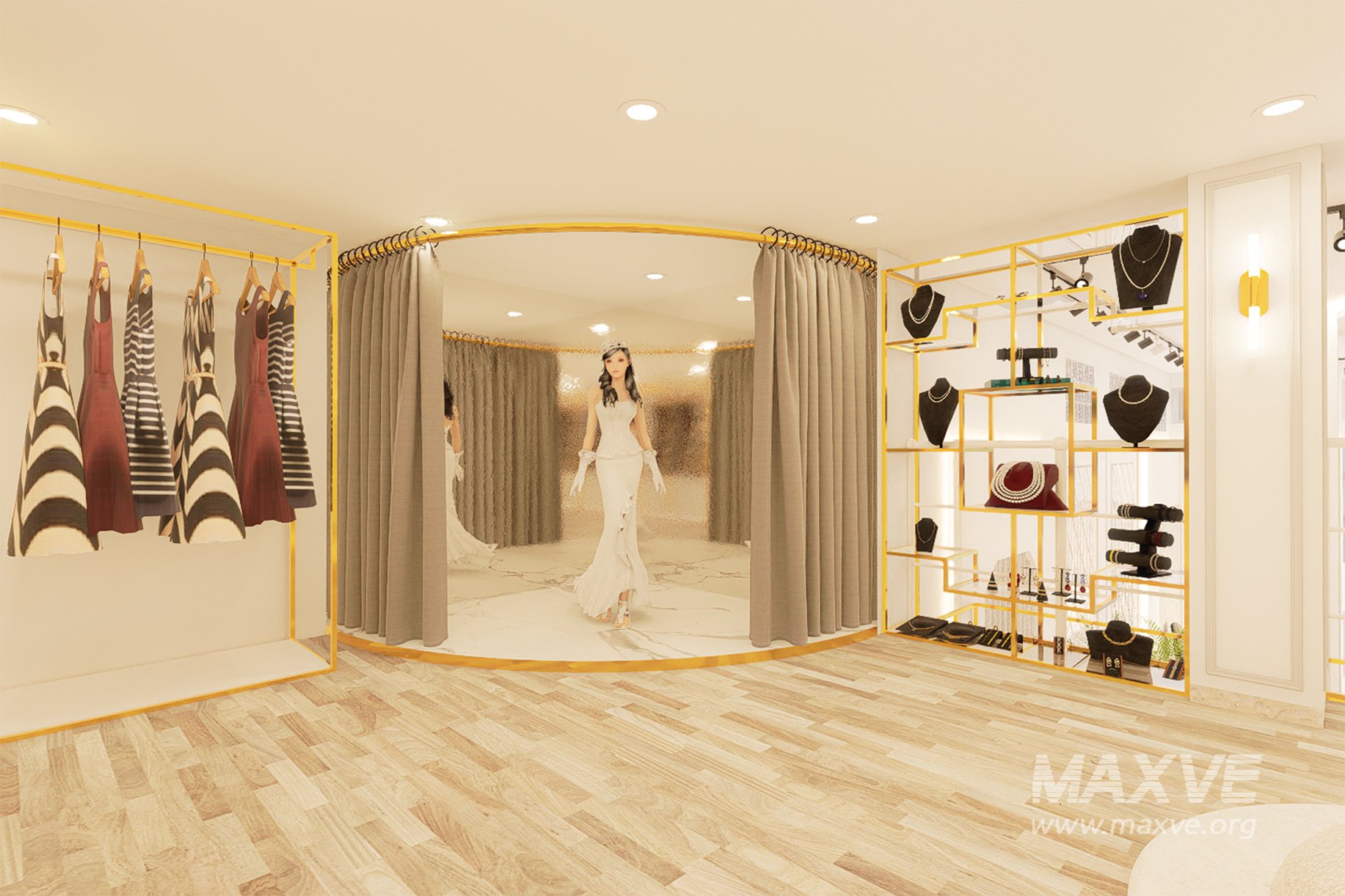 High-quality 3D model of a wedding boutique interior, covering a 150 m² retail space designed for the sale and rental of traditional and modern wedding outfits.