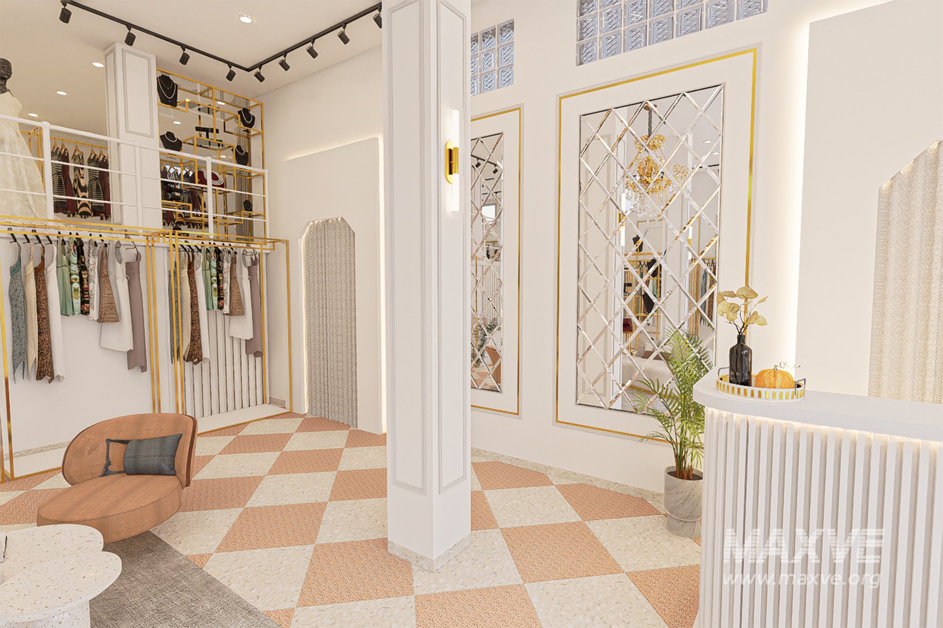 With a refined mix of light wood, marble, glass, and soft fabrics, this boutique creates a luxurious and modern atmosphere perfect for architectural visualization, interior rendering, or 3D presentation projects.
