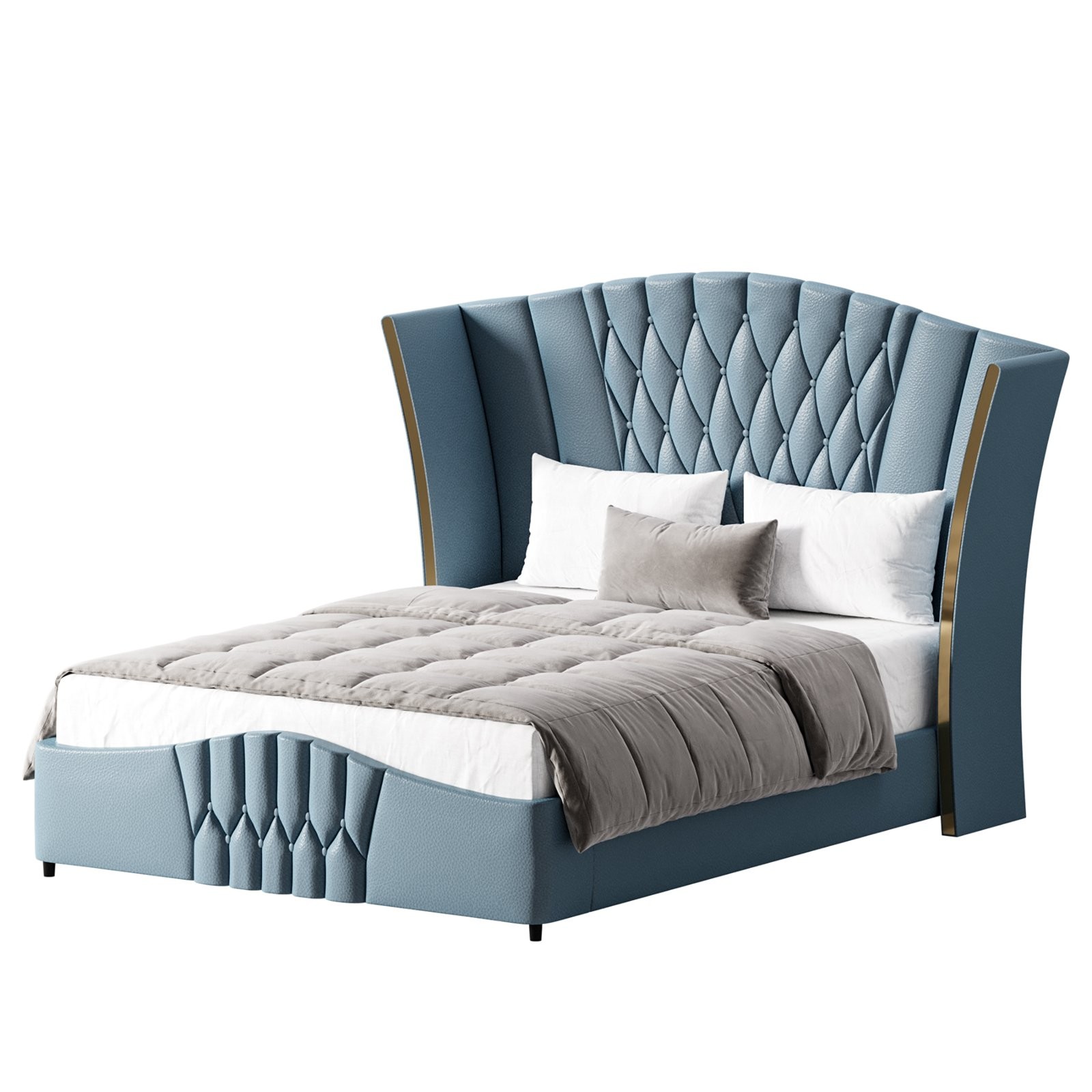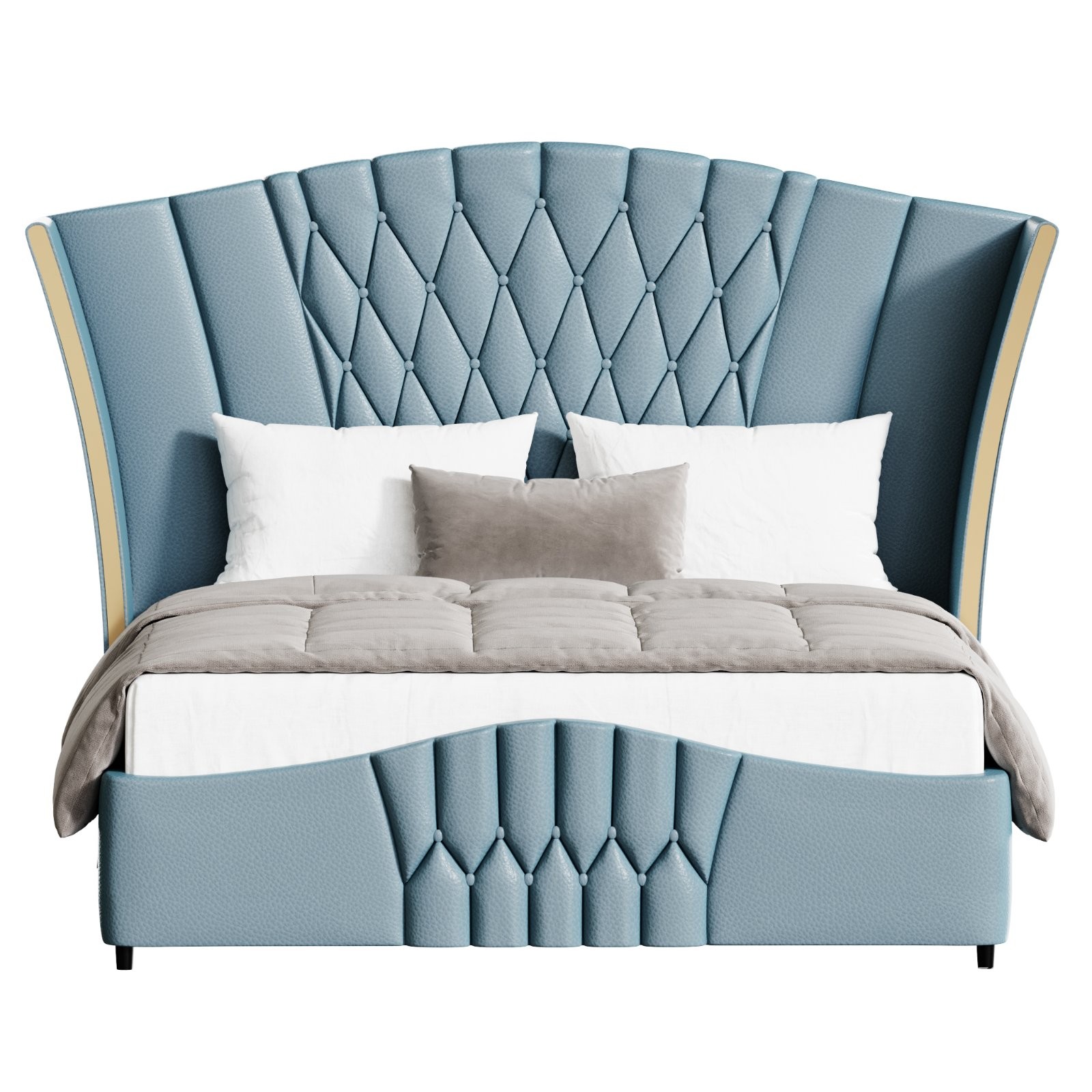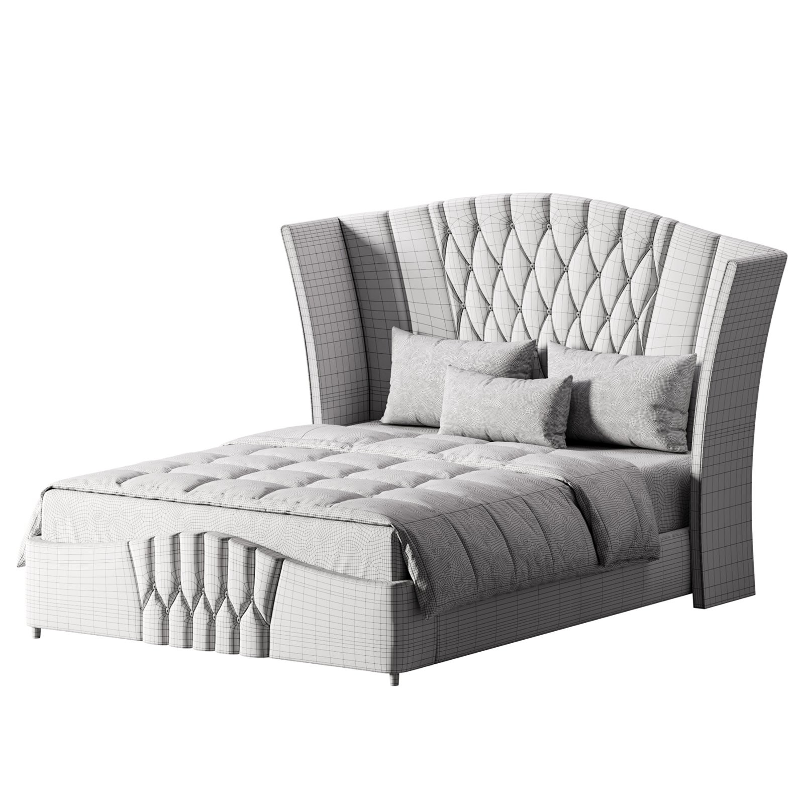Description: A luxurious modern upholstered bed inspired by contemporary Camerone design, featuring a tall winged headboard with deep diamond tufting and refined vertical paneling. The model showcases premium fabric upholstery with realistic stitching details, soft cushioning, and elegant metallic side accents that add a subtle touch of sophistication. Carefully modeled pillows, mattress, and bedding enhance realism, making this asset ideal for high-end bedroom interior visualizations, furniture catalogs, and architectural renders. Clean topology and accurate proportions ensure professional results in detailed close-up and wide interior scenes.