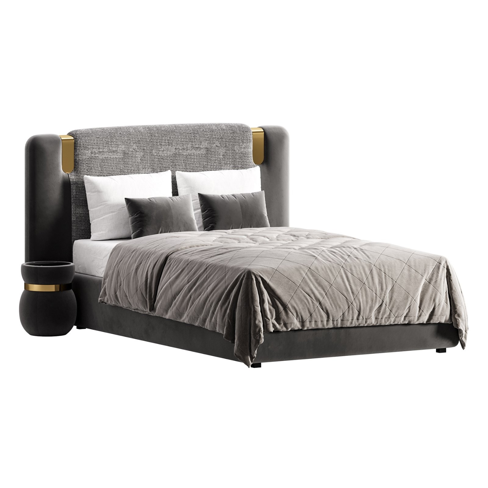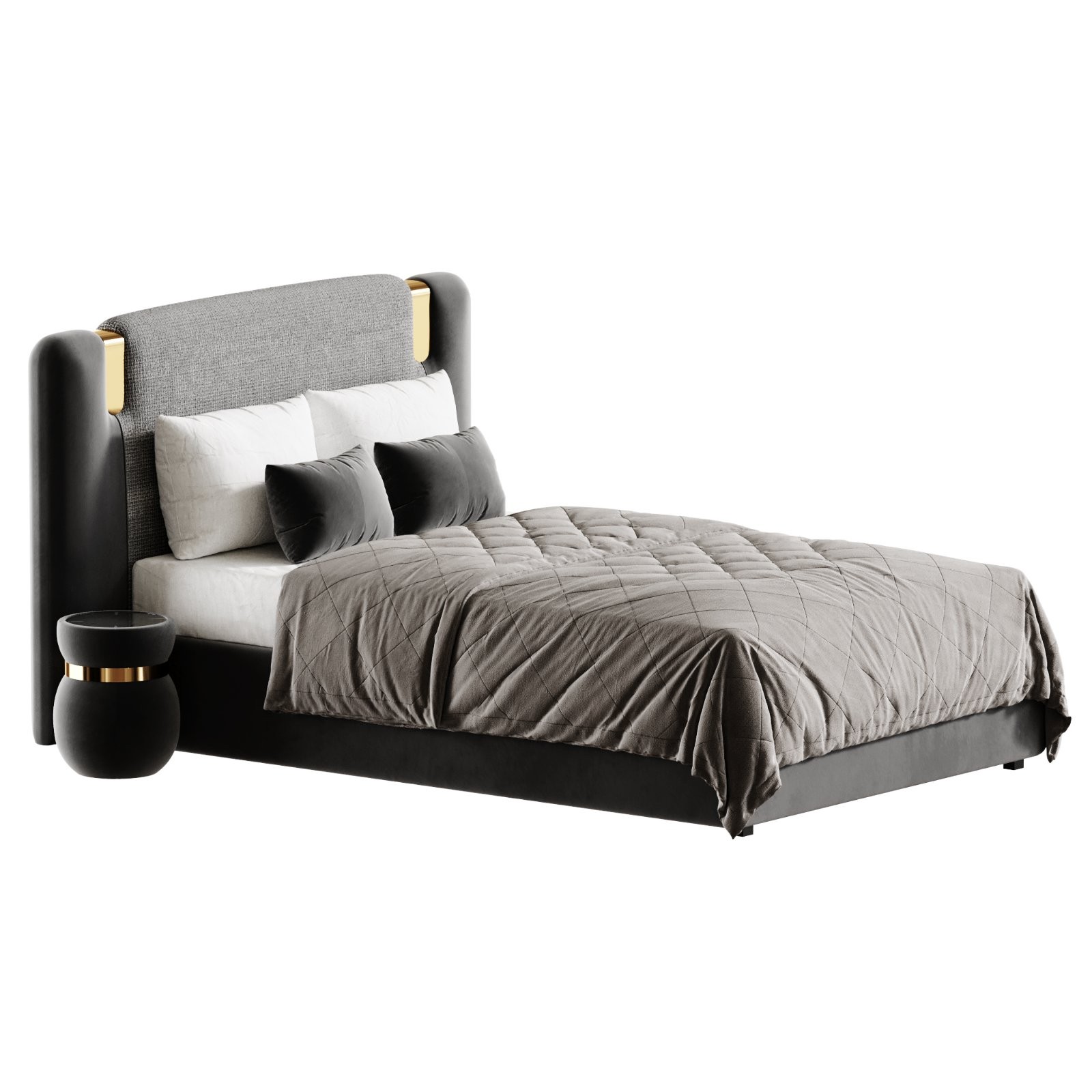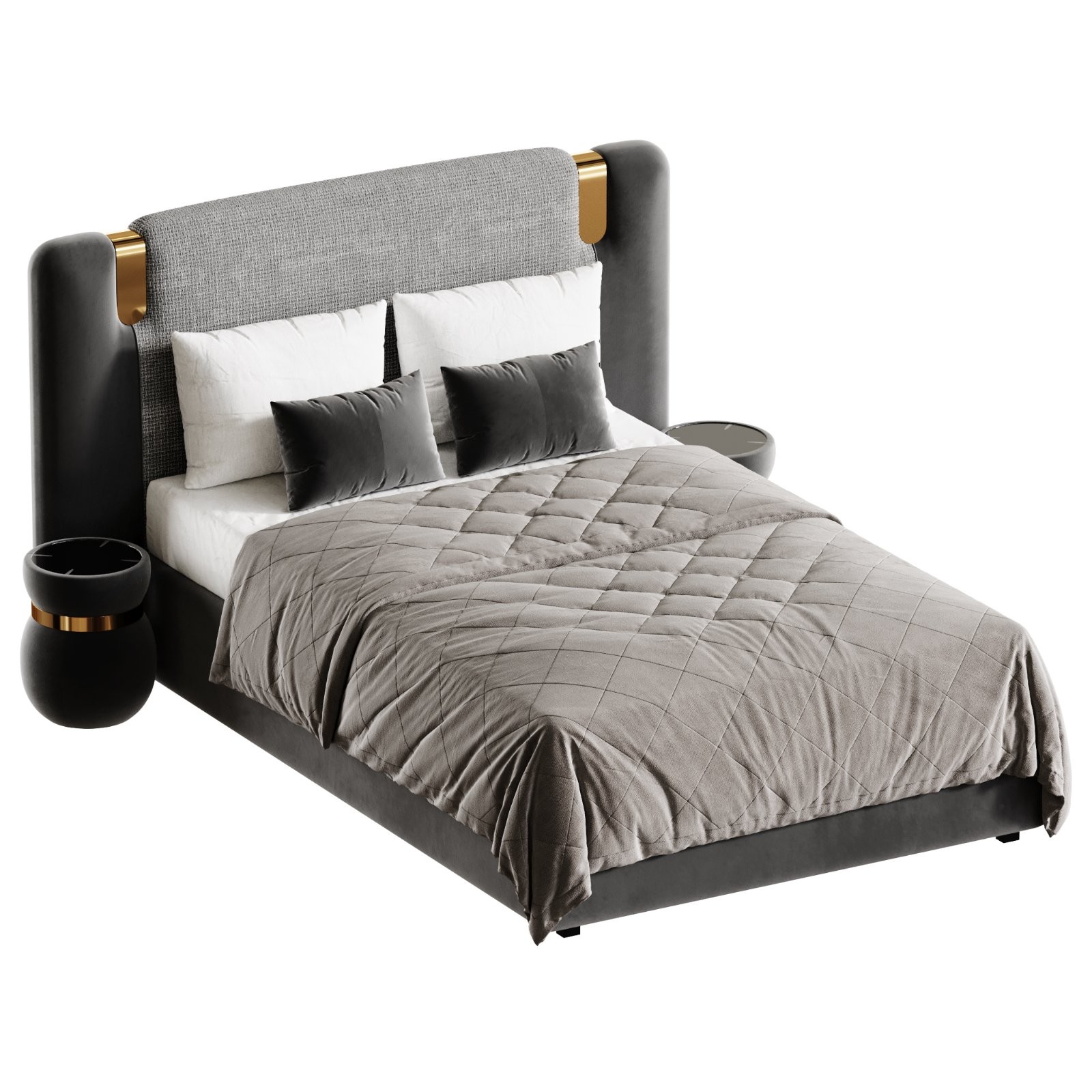 Description: A premium contemporary bed headboard model featuring the elegant Allure design with softly rounded side panels and a refined upholstered central section. The model combines smooth leather-like surfaces with textured fabric upholstery, enhanced by subtle metallic accent details that emphasize its luxury character. High-density cushioning, realistic fabric folds, and carefully modeled bedding elements provide a high level of realism suitable for close-up renders. This asset is ideal for upscale bedroom interior visualizations, luxury furniture presentations, hotel projects, and architectural renders where refined modern aesthetics are required.