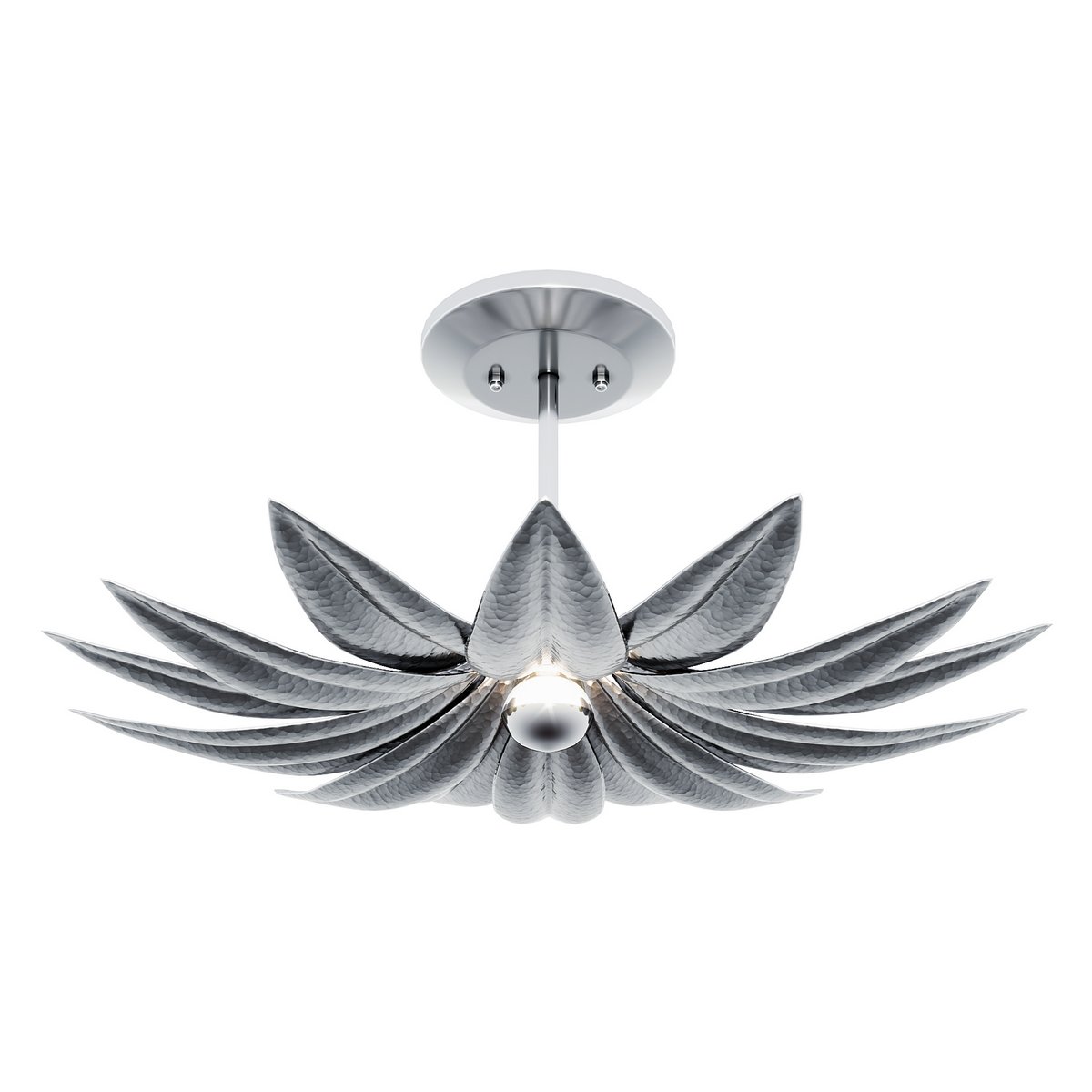 The Alithea Small Semi-Flush Mount is made of brass in an antique brass finish. The petals on this nature-inspired gold sconce have been hand-hammered to give them lifelike personality. Designed by Tom Caldwell, the floral semi-flush will be a pretty addition to any space it illuminates. The button-like bulb brings the metal a luminous sheen.