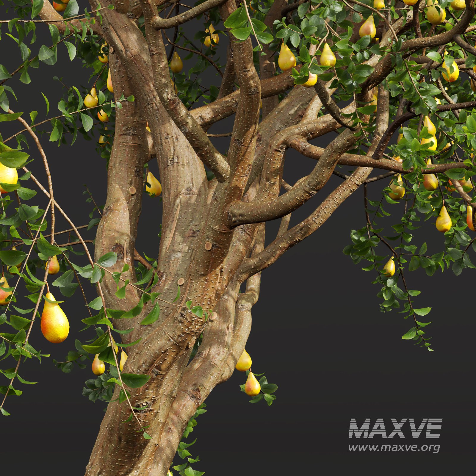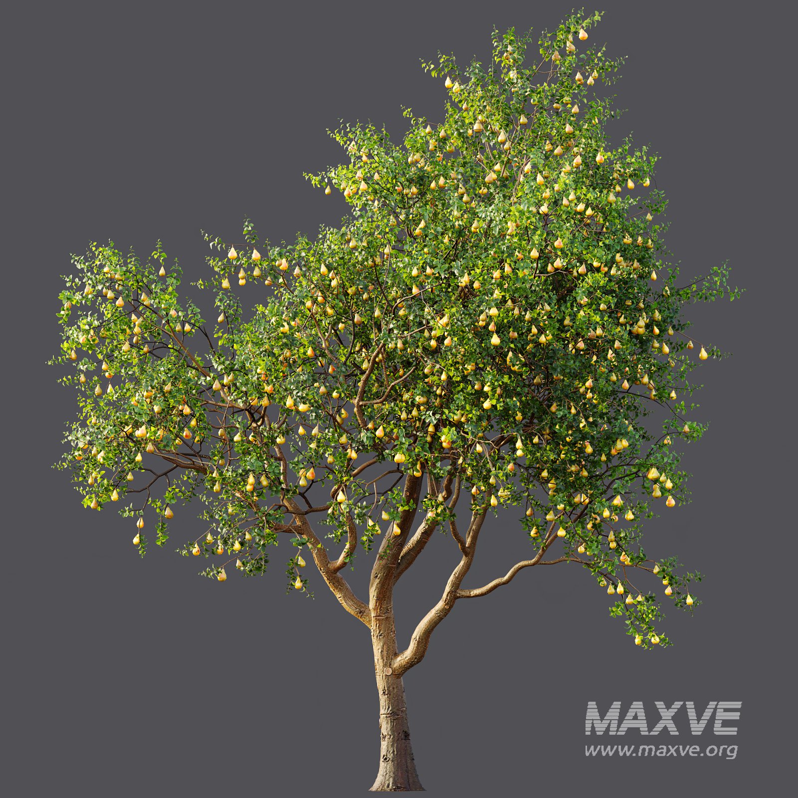 The **Pyrus communis**, a heritage European pear tree with origins in temperate Europe and Western Asia, features a canopy bursting with golden-yellow pears, carefully modeled to reflect realistic shape, texture, and subtle imperfections. Its gracefully spreading branches and fine bark detail add depth and authenticity, ideal for close-up renders or wide landscape compositions.