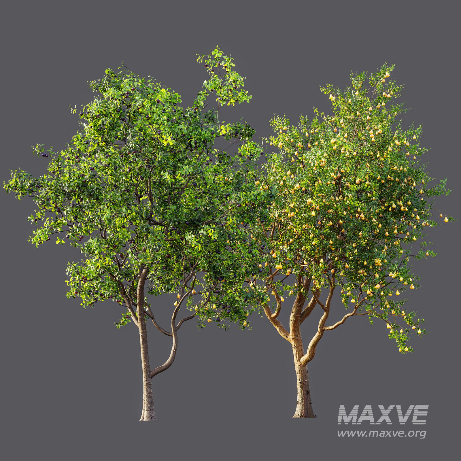 This meticulously crafted 3D model set presents two iconic and botanically accurate fruit trees — the **Prunus salicina** (Japanese Plum) and the **Pyrus communis** (European Pear) — modeled with stunning realism for high-end architectural visualizations and natural landscape renders.