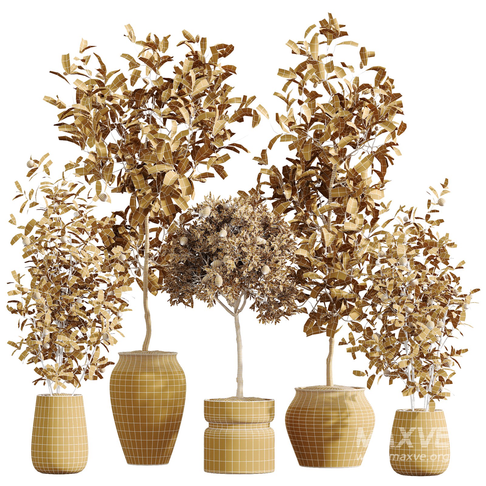 This vibrant indoor plant set showcases a selection of fruit-bearing trees and bonsai: Citrus Fruit Lemon Tree, China Orange Bonsai (Calamondin), and Briful Pachira Aquatica. Each plant is presented in elegant clay or ceramic planters, adding a rustic yet refined aesthetic. The variety of fruit shapes and foliage textures brings authenticity and visual charm to kitchen scenes, cafes, balconies, luxury interiors, or wellness visualizations.