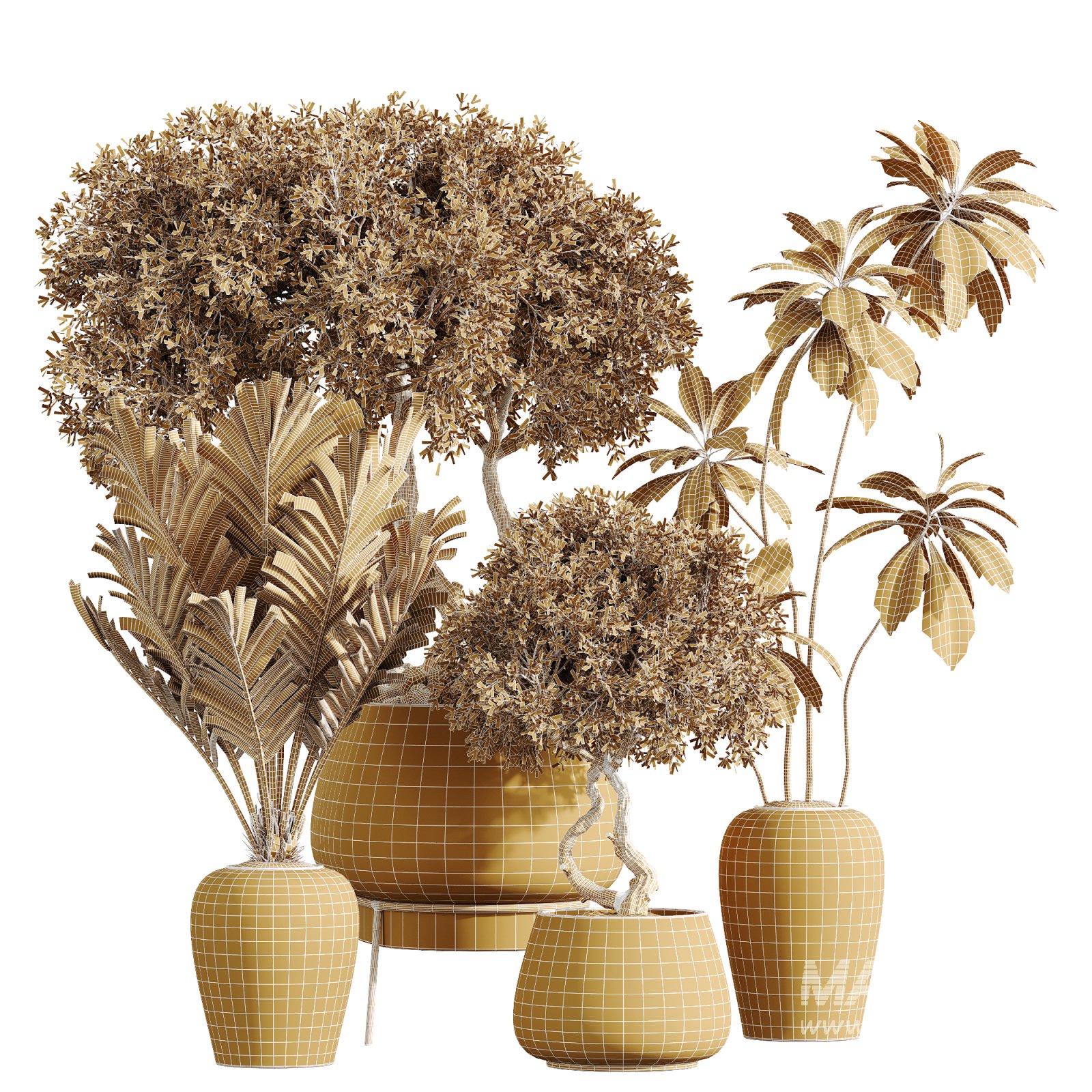 The foliage is rich in character—from the twisted trunk of the olive bonsai and the layered fronds of the palm to the smooth, broad-leaf structure of the ficus—all modeled with precision for photorealistic close-ups and wide-angle interiors.