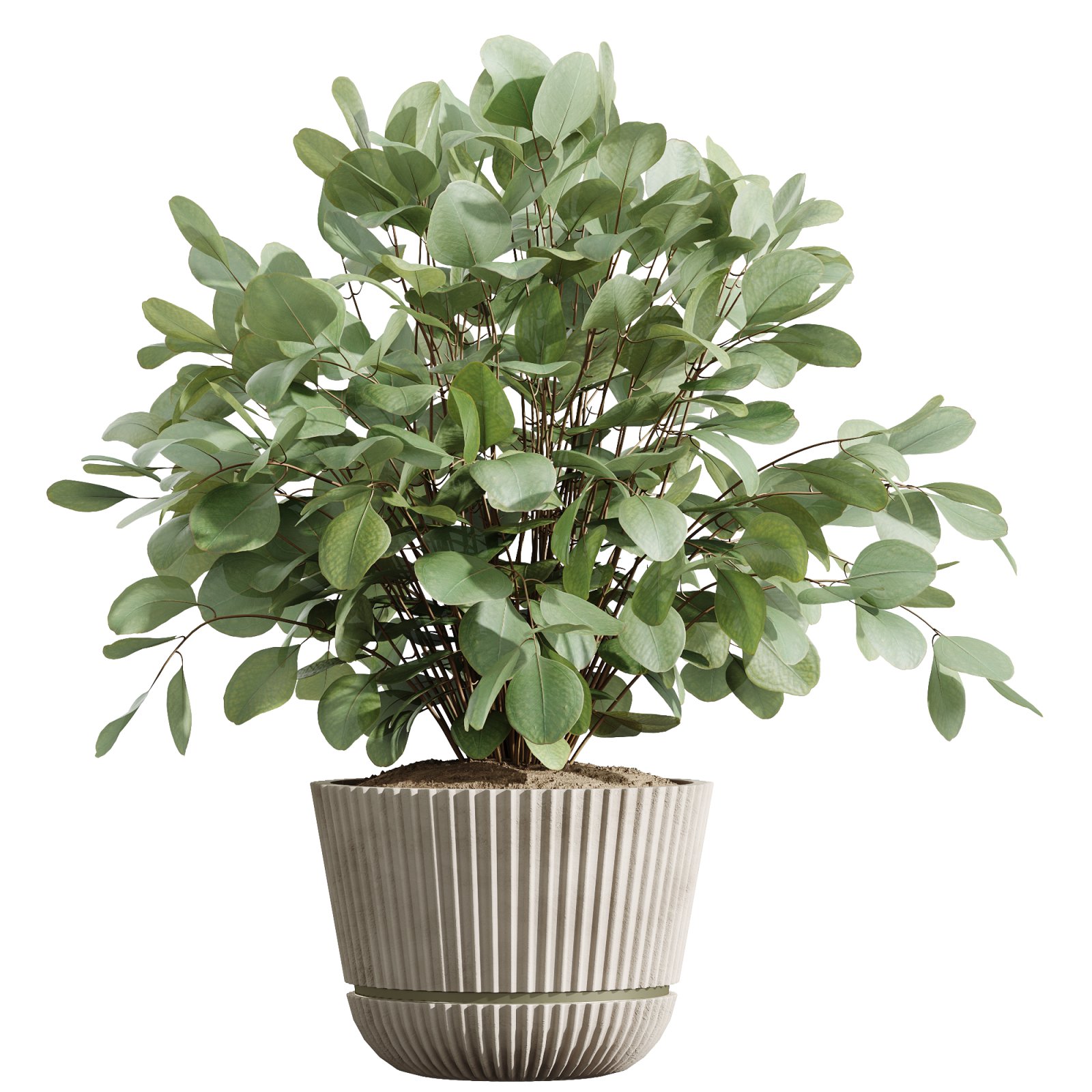 All plants are placed in a series of handcrafted concrete planters featuring vertically ribbed surfaces and polygonal silhouettes. Rendered in natural ash-beige tones, the pots exhibit subtle grain, sharp chamfers, and lightly pitted matte finishes. Their consistent visual language and architectural geometry bring unity to the arrangement while allowing the individual plant forms to remain distinct.