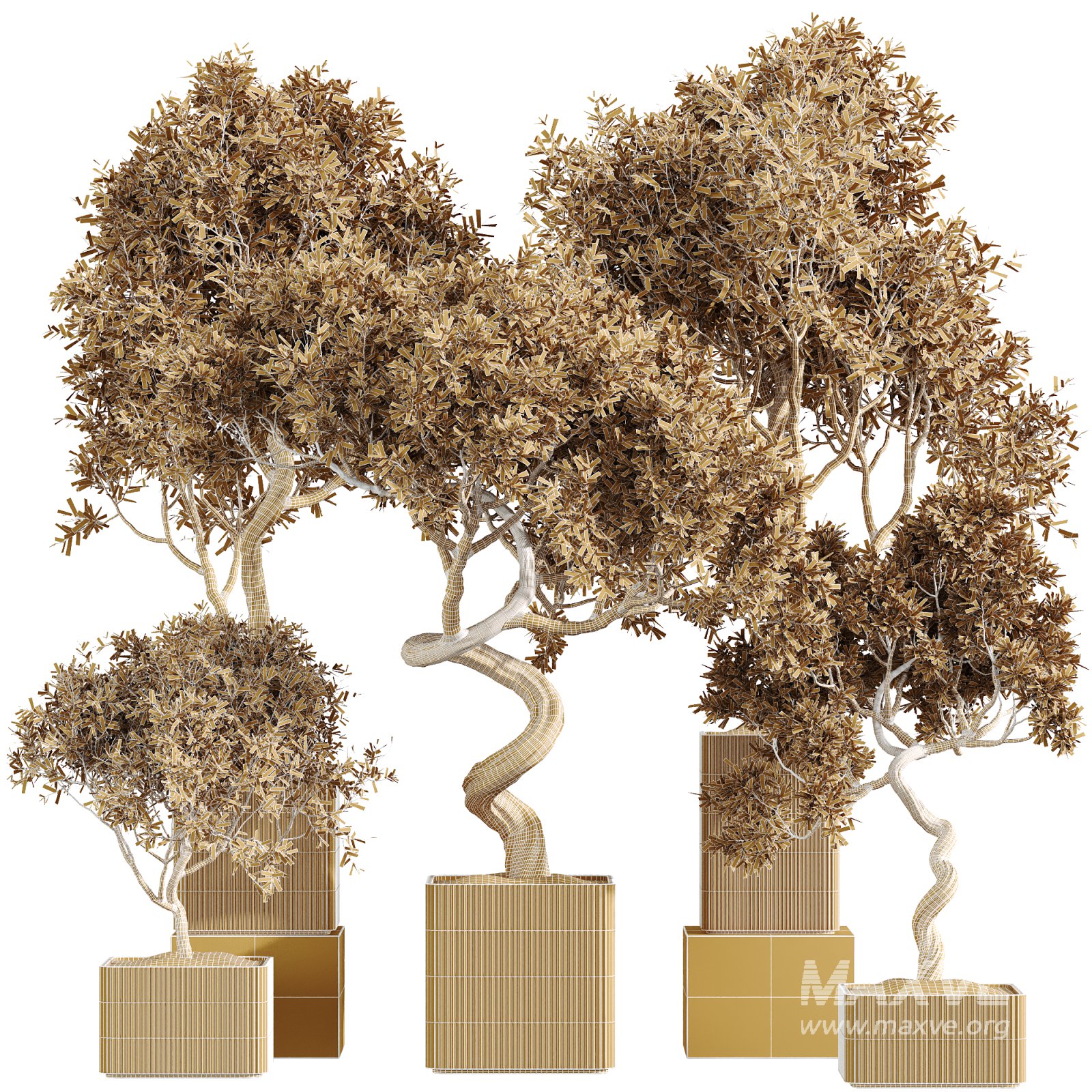 The AV Indoor Plants Set 236 presents five uniquely sculpted Mediterranean olive trees. This collection evokes the age-old grace of Olea Europaea through expressive trunks, weathered curves, and compact, silvery foliage—carefully curated for upscale architectural interiors.