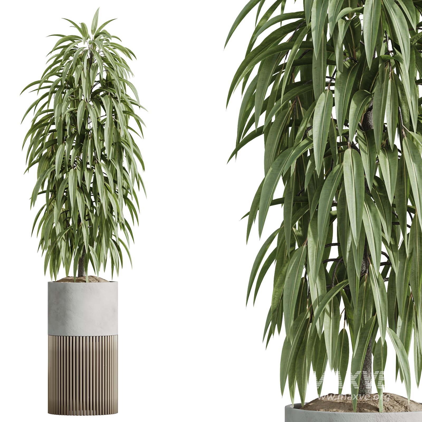 Planters are rendered in smooth and fluted concrete designs, some raised on metallic legs, creating elevation and elegance for gallery interiors, architectural lobbies, or premium residential scenes. Each plant is modeled with care for realism, from leaf structure to trunk silhouette, making the set a perfect fit for calm, design-conscious visualizations.