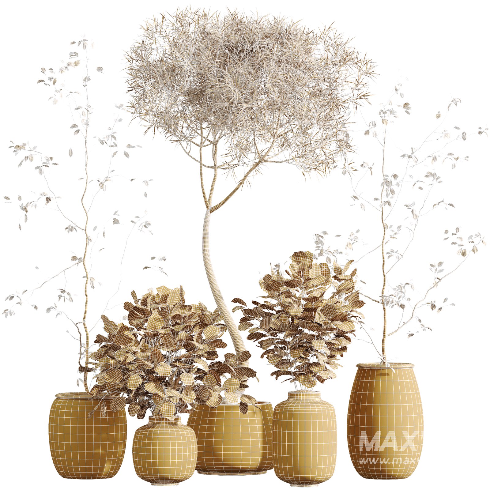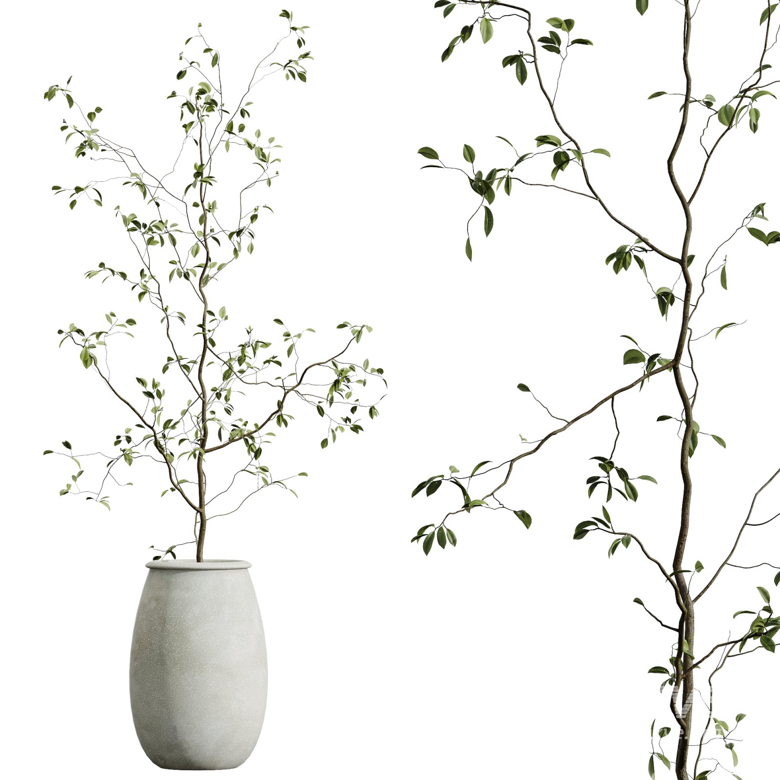 This refined indoor plant collection celebrates minimalist aesthetics and botanical authenticity. Featuring the slender, expressive silhouette of the Japandi-style Ficus Dracaena Marginata and the soft, rounded foliage of the Dollar Eucalyptus bouquet, this arrangement radiates balance and visual freshness. The Eucalyptus, known for its calming fragrance and silvery-green tone, evokes the serene landscapes of Australia. Paired with the bold lines of Ficus, it offers a unique contrast ideal for modern interiors. Each plant is elegantly placed in hand-crafted ceramic or concrete-inspired pots with earthy textures, designed to enhance architectural renders with a touch of poetic realism.