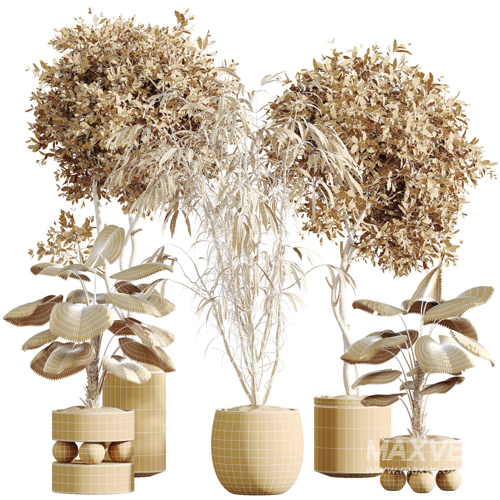 This premium 3D model set features three distinctive species with complementary aesthetics. Licuala Grandis Palm introduces bold tropical character with its large, pleated fan-shaped leaves. The Olive tree (Olea) brings Mediterranean elegance with silvery foliage and graceful branching. Japandi Ficus Dracaena Marginata adds refined minimalism with slender stems and airy foliage, embodying calm sophistication. Together, they create a balanced ensemble ideal for luxury interiors and architectural visualizations.