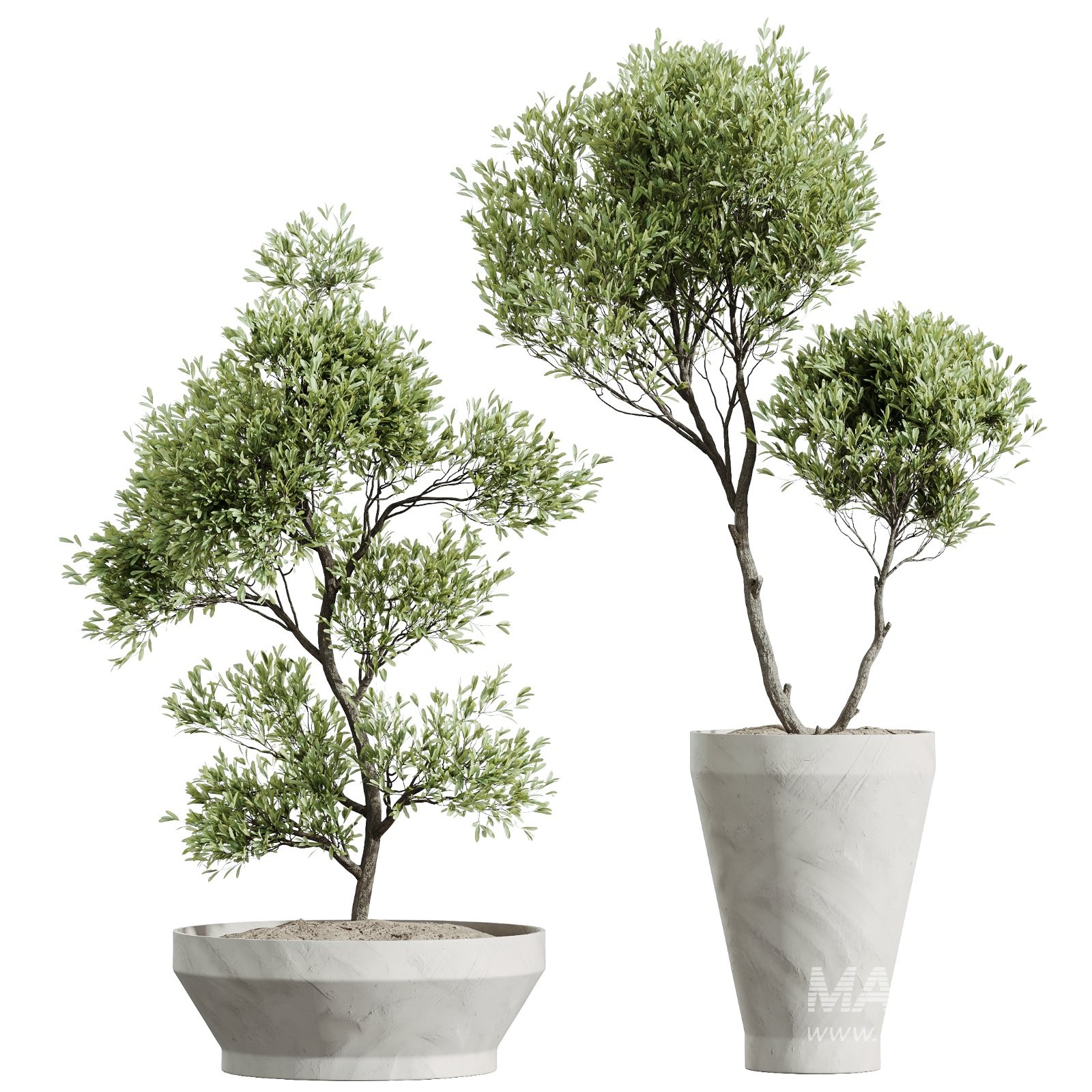 Each model is carefully crafted to emphasize realistic leaf behavior, organic branch structure, and clean proportions, making the set ideal for high-end residential interiors, lobbies, offices, hospitality spaces, showrooms, and architectural visualizations. The combination of sculptural foliage and minimalist planters delivers a sophisticated look that works equally well as focal elements or supporting greenery within complex interior scenes.