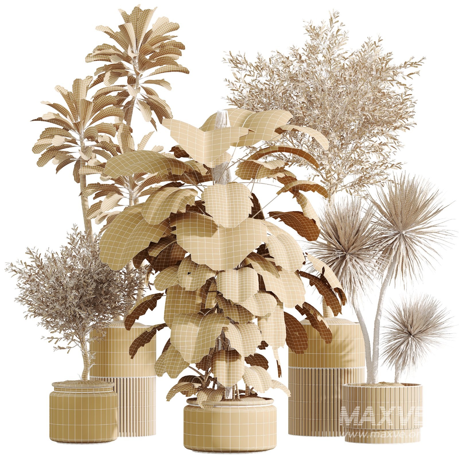 Create stylish and contemporary interior scenes with this premium indoor plant collection featuring Spineless Yucca Palm, Elegant Monstera, Olive Elegant Tree, and Euphorbia drupifera. Each plant is carefully modeled to capture realistic leaf shapes, natural branching, and balanced proportions, making this set ideal for high-end interior archviz and design visualizations.