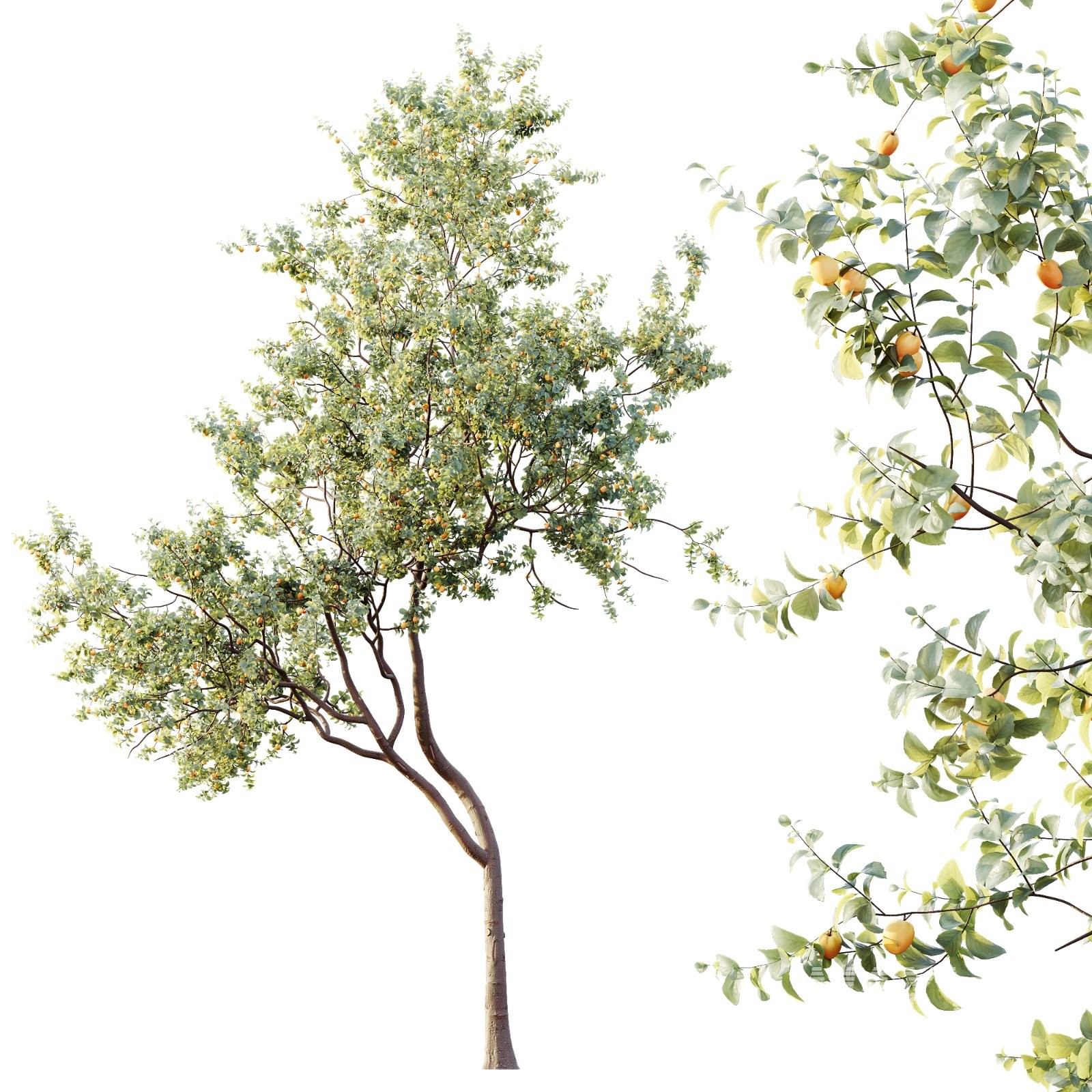 A detailed collection of Armeniaca Vulgaris (Prunus / Apricot Tree) models designed for high-end architectural visualization and natural landscape environments. These trees feature elegant branching structures, soft curving trunks, and dense seasonal foliage with fruit detail, providing a realistic and vibrant presence in exterior scenes.