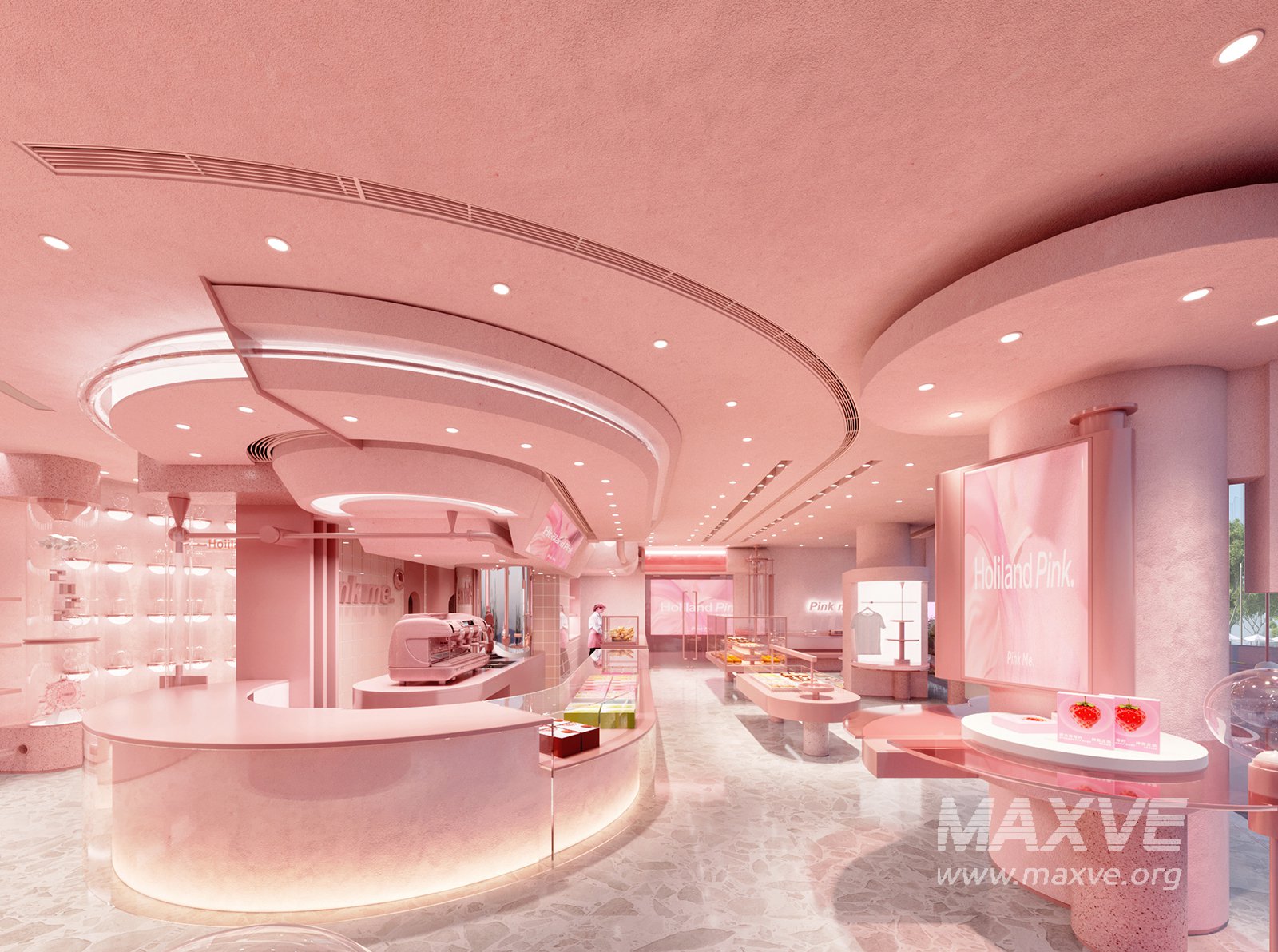 This Modern bakery 3D scene was built in 3ds Max 2021 and rendered using Corona. It includes clean geometry, proper scene organization, and is optimized for smooth rendering performance. The model setup follows standard practices, making it easy to import and adapt into a variety of workflows. Delivered in MAX format, it is well-suited for architectural visualization, concept development, or design presentation. Dominant color tones include: White tones, Pink tones, Beige tones.