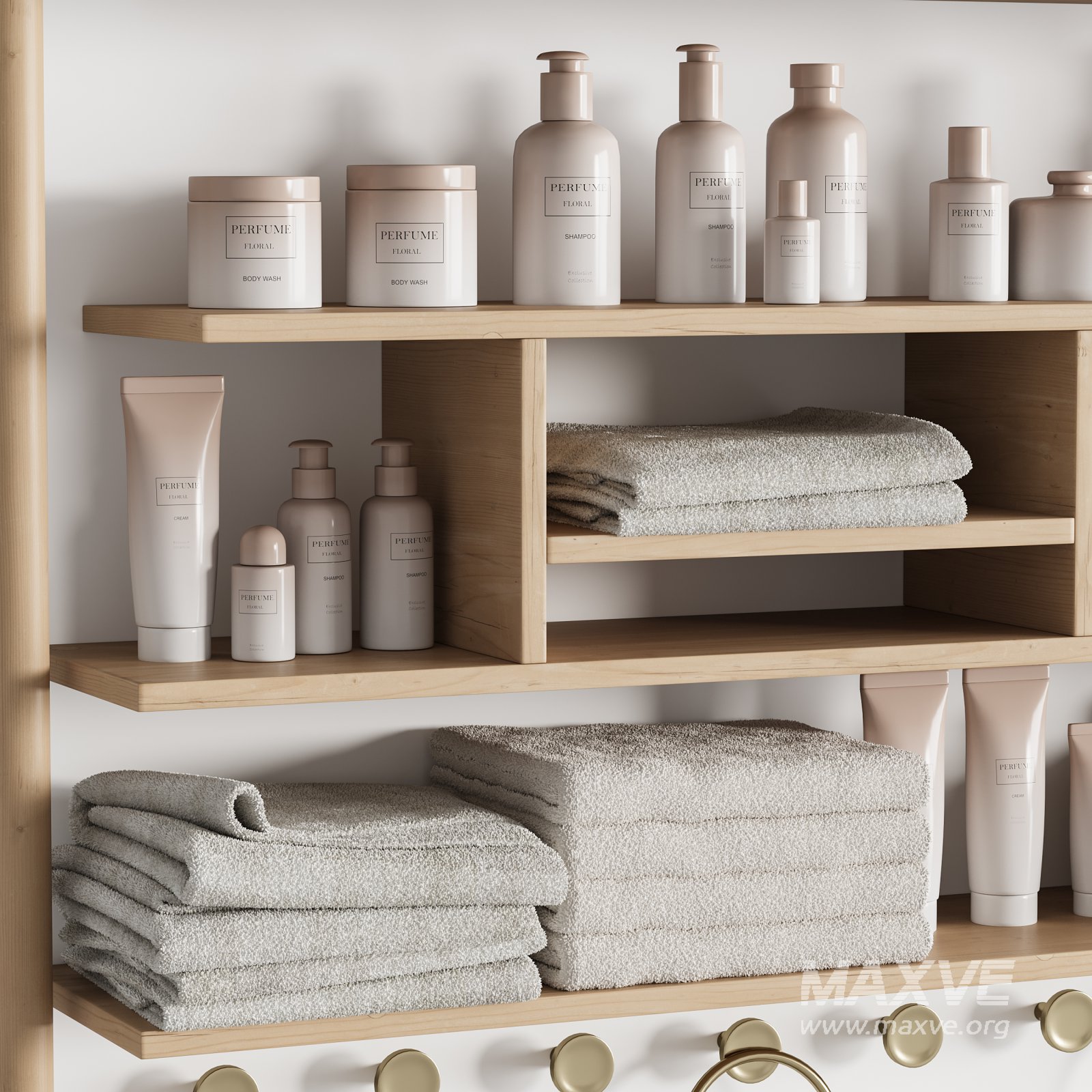 Description: This 3D model set contains a complete collection of bathroom accessories and storage elements, ideal for interior visualization projects. The set includes open wall shelving units filled with cosmetic bottles, rolled and folded towels, hanging hooks with towel rings, a freestanding towel rack, a small bench with a hairdryer, a stool with a fragrance diffuser, and a quilted laundry basket with a throw blanket. All elements are designed in a modern natural wood style with neutral beige textiles and soft pastel-colored packaging for the cosmetics. The model is optimized for Corona Renderer 10 and ensures high-detail material rendering for close-up bathroom shots and lifestyle scenes.