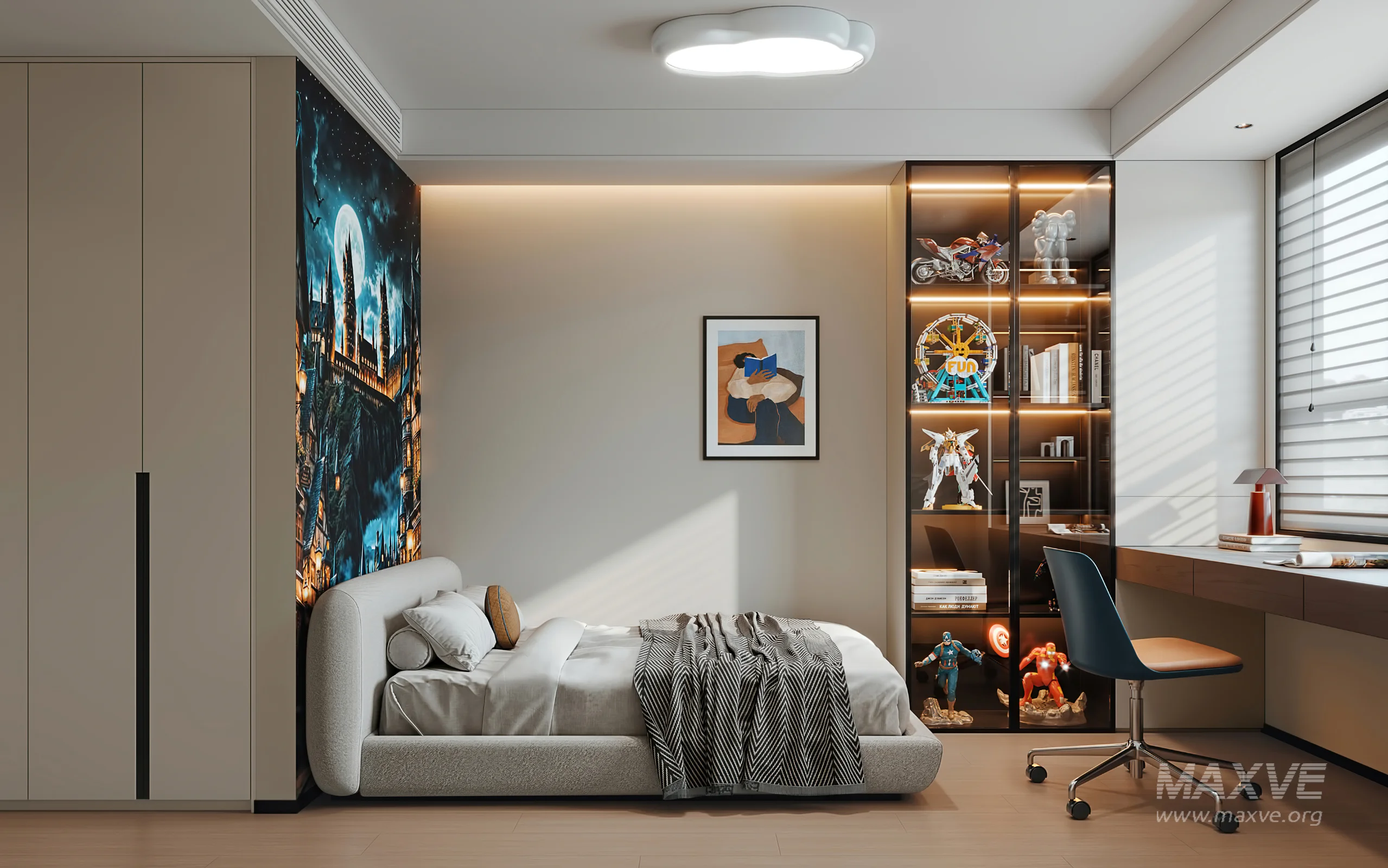 This Modern Bedroom interior 3D scene was built in 3ds Max 2021 and rendered using Corona. It includes clean geometry, proper scene organization, and is optimized for smooth rendering performance. The model setup follows standard practices, making it easy to import and adapt into a variety of workflows. Delivered in MAX format, it is well-suited for architectural visualization, concept development, or design presentation. Dominant color tones include: White tones, Beige tones, Silver tones.