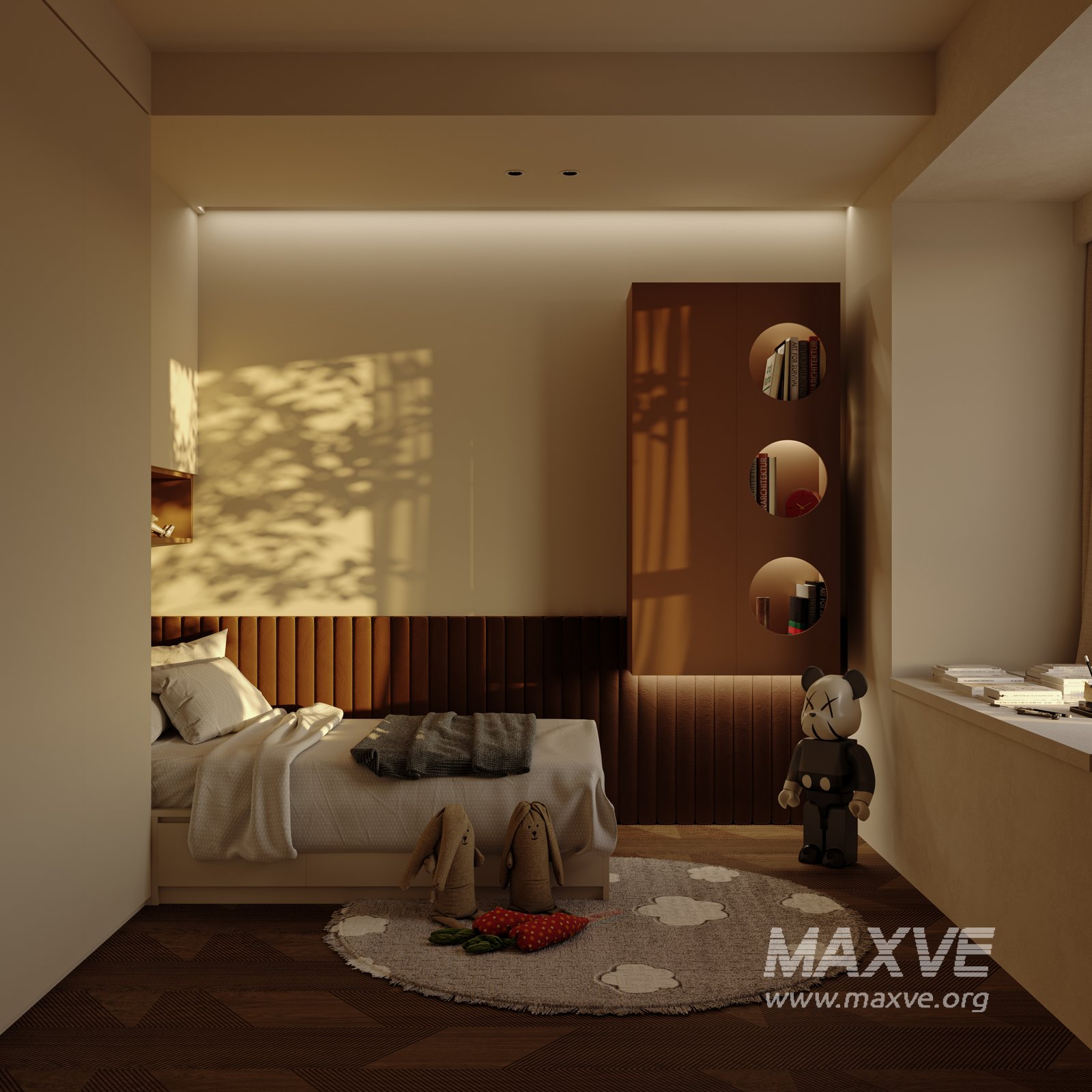 This fully textured interior scene with natural light setup is ready to render with Corona Renderer for 3D Studio MAX. This file does not have any type of protection. You can reuse the scene, the render settings, the lights, the materials, but above all, you can learn from the file by moving inside the project, observing how the light was created and handled, how materials are developed, what role each texture plays within them, and the values used in every single option.