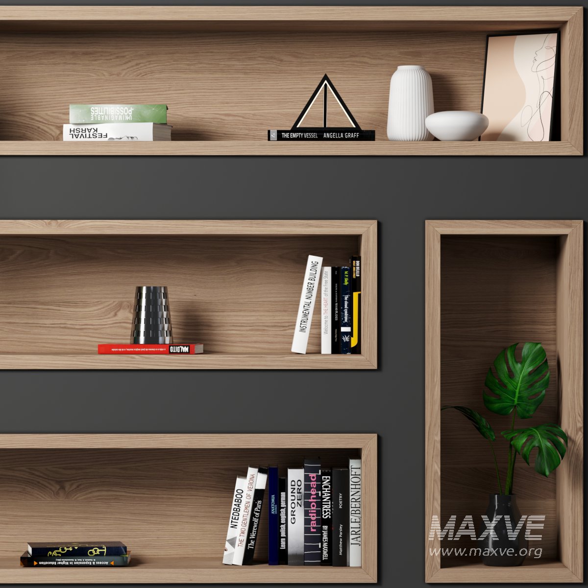 ● Each Bookcase is a separate object and you can easily change it for your project.