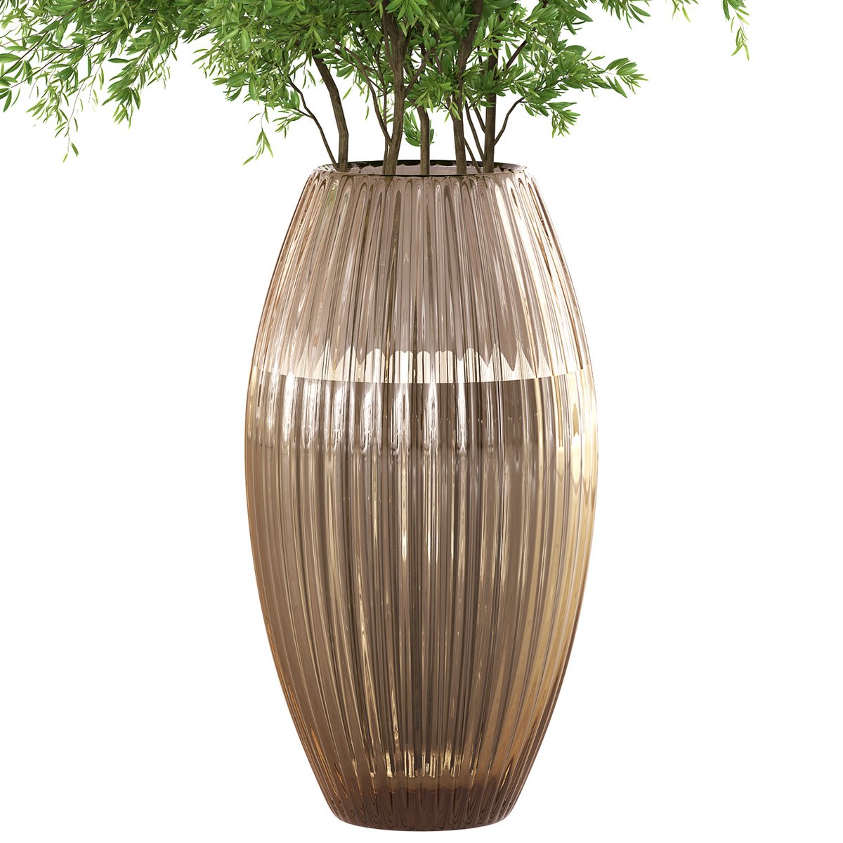 A realistic green bouquet with plants and branches, and a glass flower pot