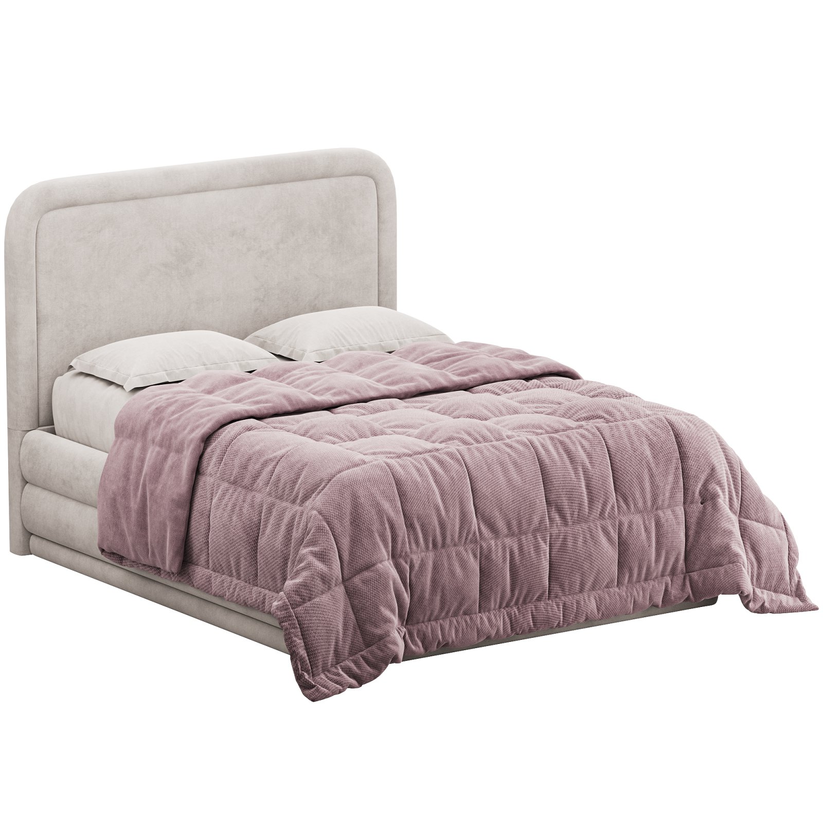 A modern upholstered bed design featuring a soft velvet finish and rounded headboard edges for added comfort. This bed offers an elegant touch to any bedroom interior, balancing simplicity with luxurious texture. The quilted bedding and soft pillows enhance the visual appeal, making it ideal for realistic interior visualizations or furniture catalogs.