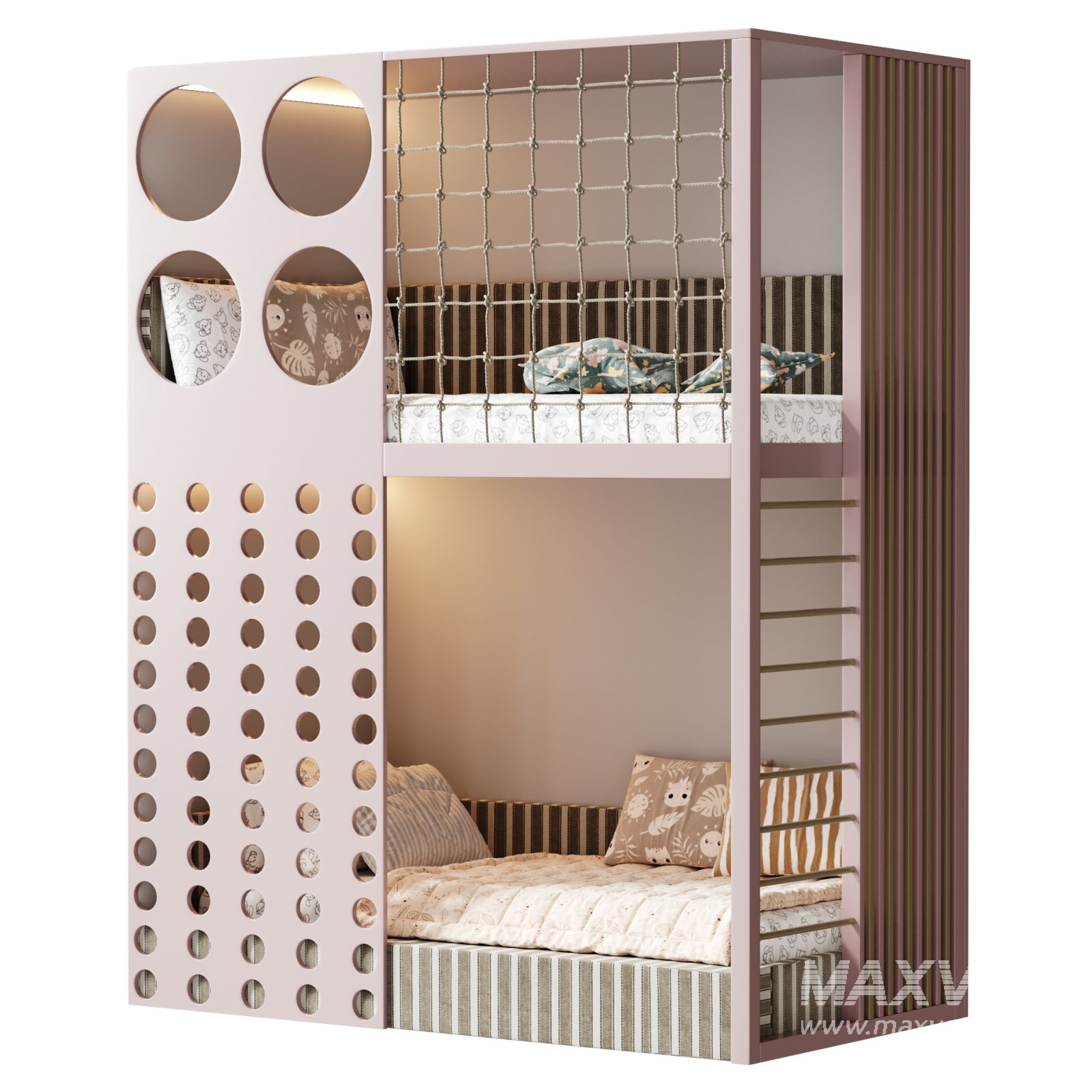 Description: A stylish and playful 3D model of a children’s bunk bed designed with modern aesthetics and safety in mind. The bed features a compact dual-level layout with rounded openings, vertical slats, and a rope safety net on the upper bunk. The combination of soft wood textures and cozy bedding gives the model a warm and welcoming feel, perfect for kid-friendly interiors. Ideal for realistic visualizations in nursery and bedroom scenes, this model combines decorative appeal with functional design.