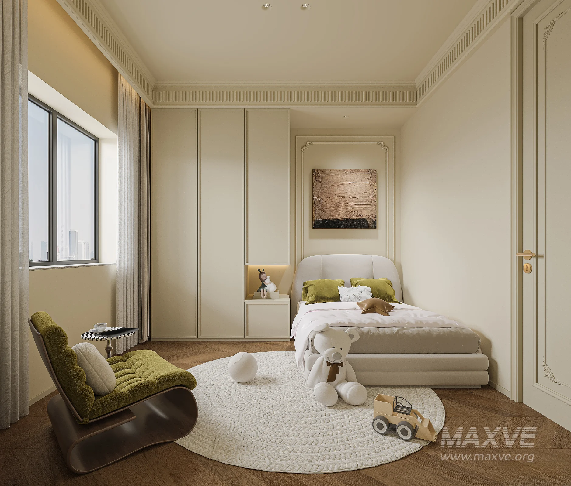 This Classic Children bedroom 3D scene was built in 3ds Max 2021 and rendered using Corona. It includes clean geometry, proper scene organization, and is optimized for smooth rendering performance. The model setup follows standard practices, making it easy to import and adapt into a variety of workflows. Delivered in MAX format, it is well-suited for architectural visualization, concept development, or design presentation. Dominant color tones include: White tones, Beige tones.