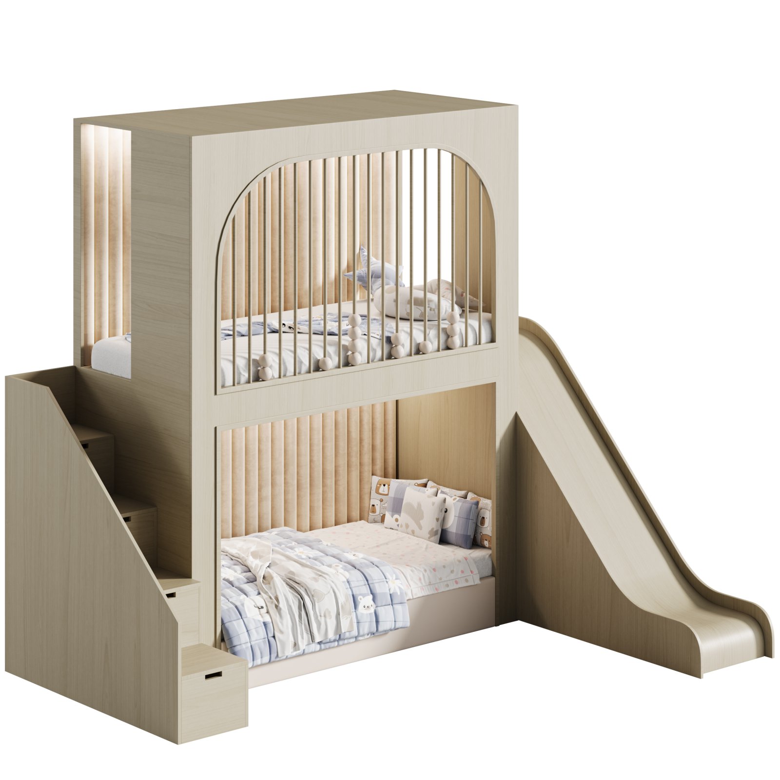 Description: A stylish and playful children's bunk bed featuring a softly arched guardrail design on the upper level, integrated vertical slats for safety, a cozy lower sleeping zone with vertical upholstered panels, and a wide slide for added fun. The left side staircase includes built-in storage drawers, making this bed both space-efficient and functional. Ideal for modern children's bedrooms, this model blends aesthetics with utility and comfort.