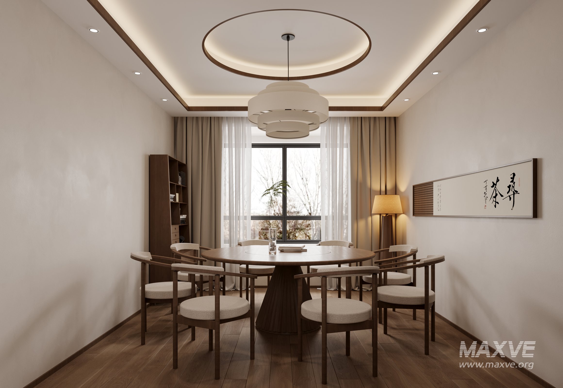 This chinese living room dining room 3D scene was built in 3ds Max 2021 and rendered using Corona. It includes clean geometry, proper scene organization, and is optimized for smooth rendering performance. The model setup follows standard practices, making it easy to import and adapt into a variety of workflows. Delivered in MAX format, it is well-suited for architectural visualization, concept development, or design presentation. Dominant color tones include: White tones, Beige tones, Gray tones.