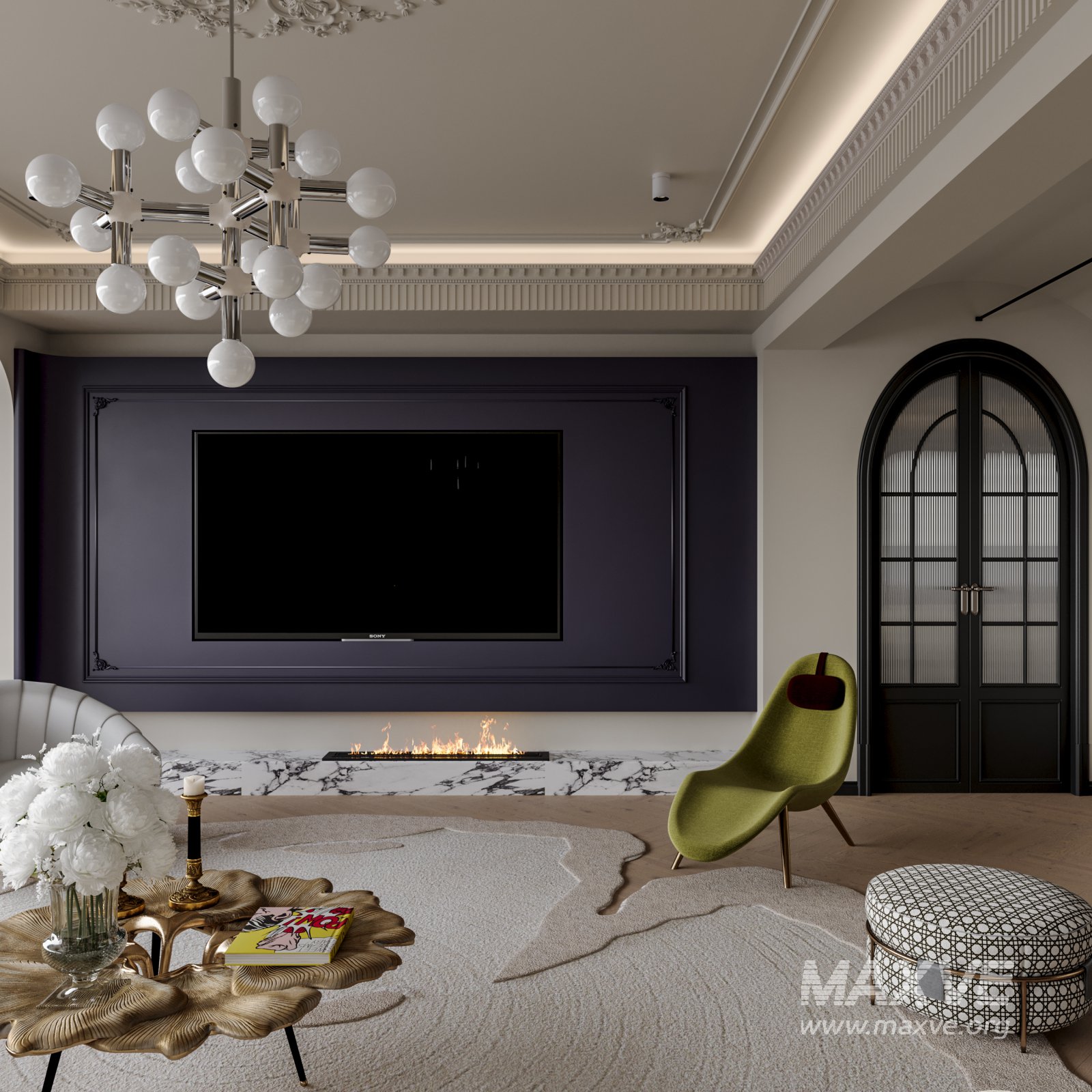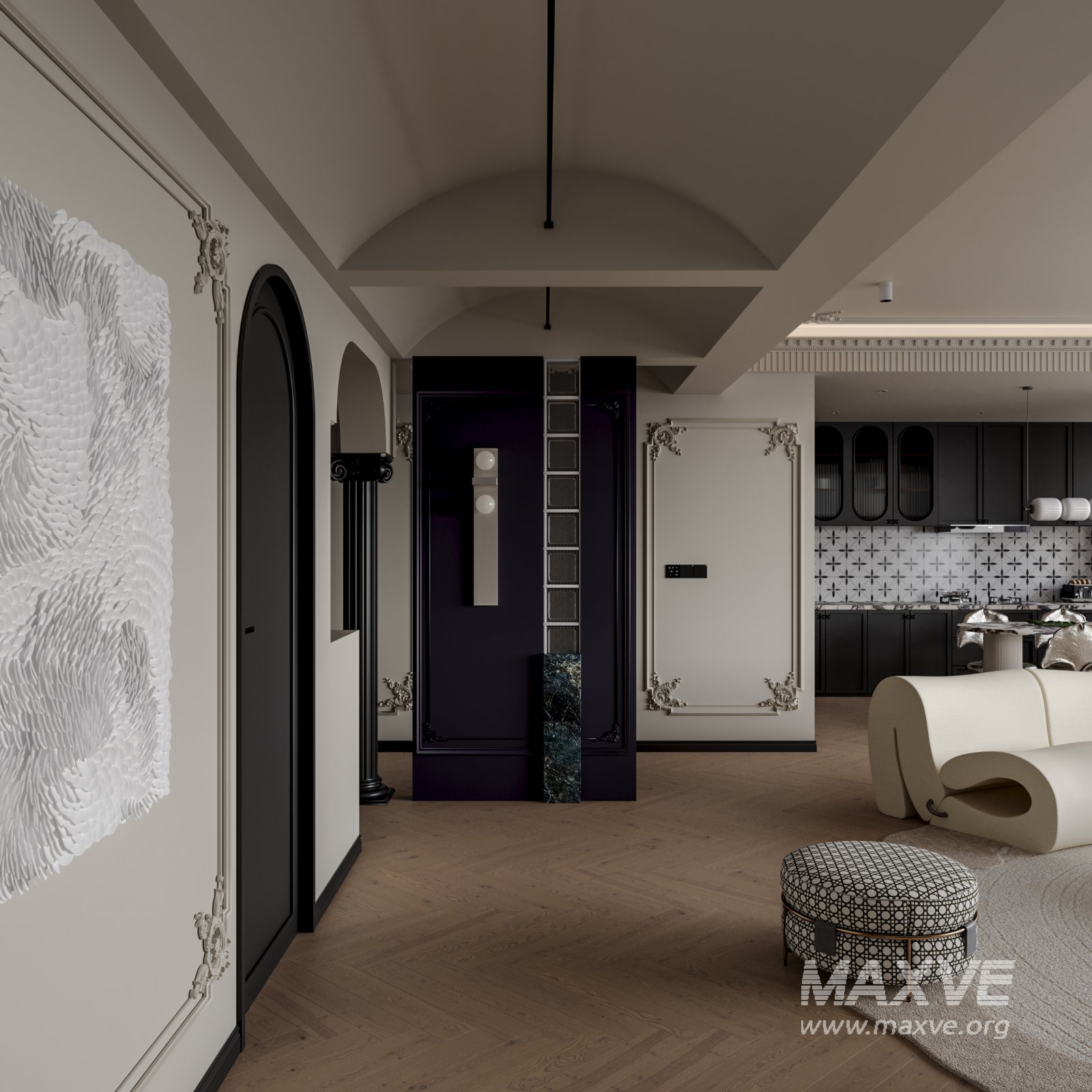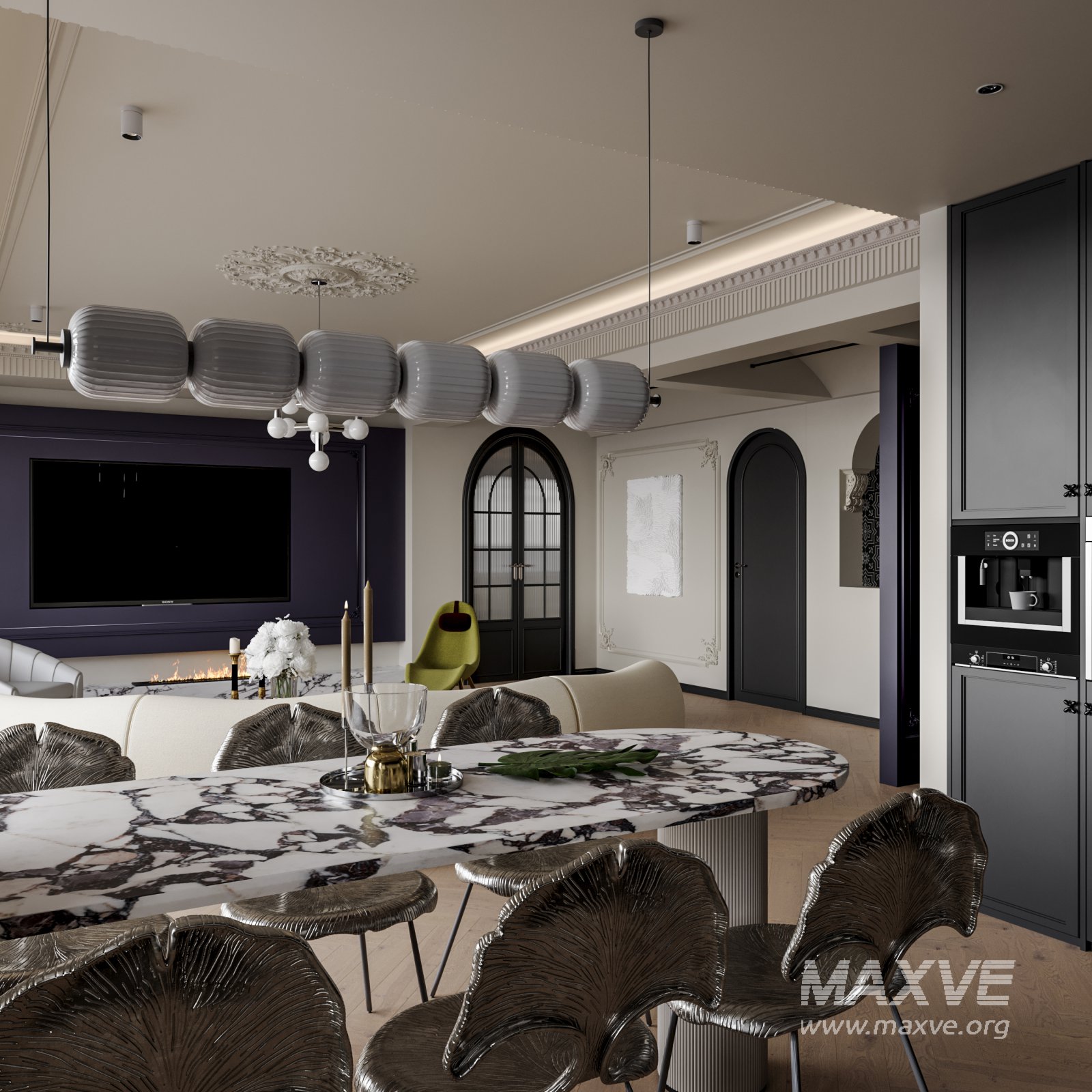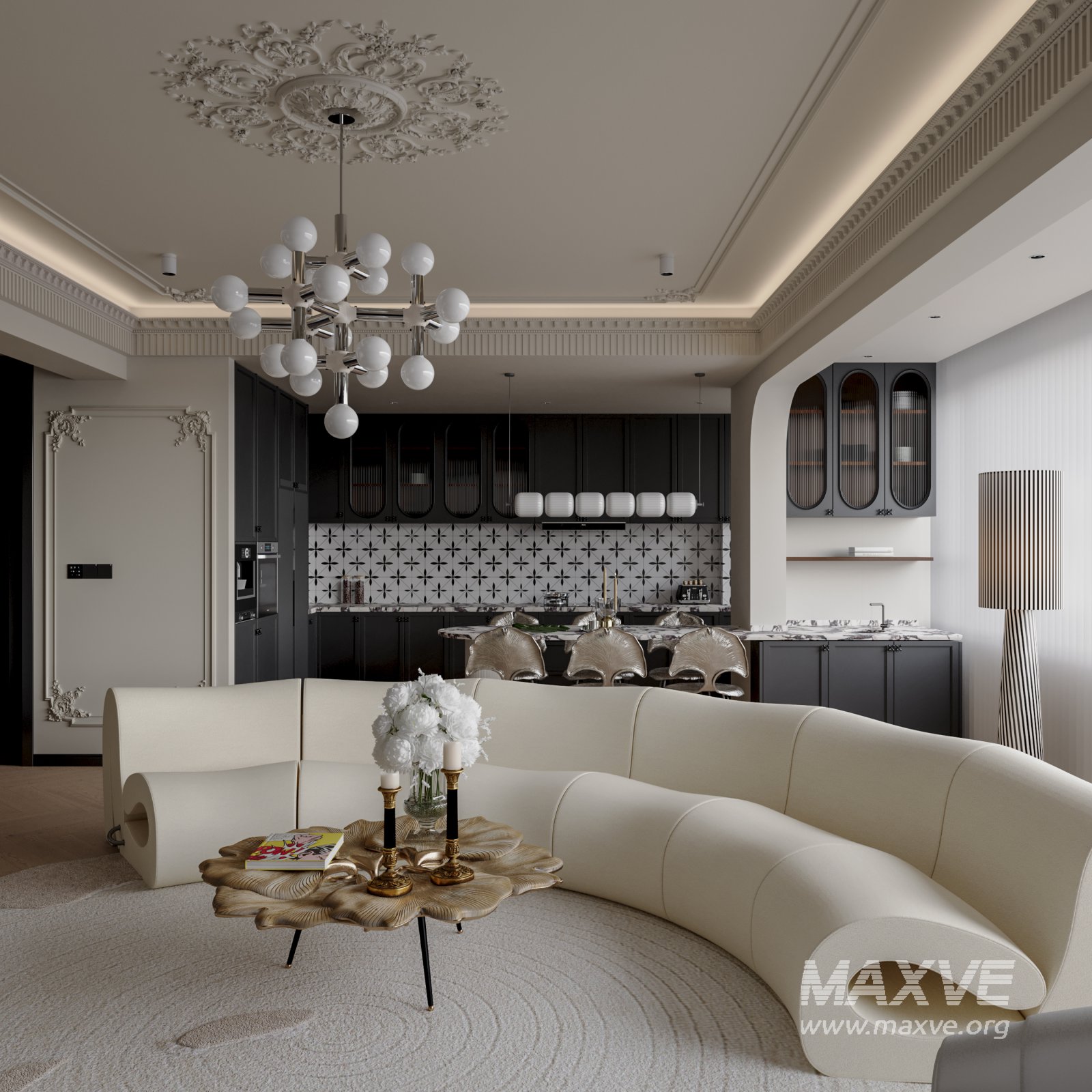 Classic luxury living room, dining room and kitchen