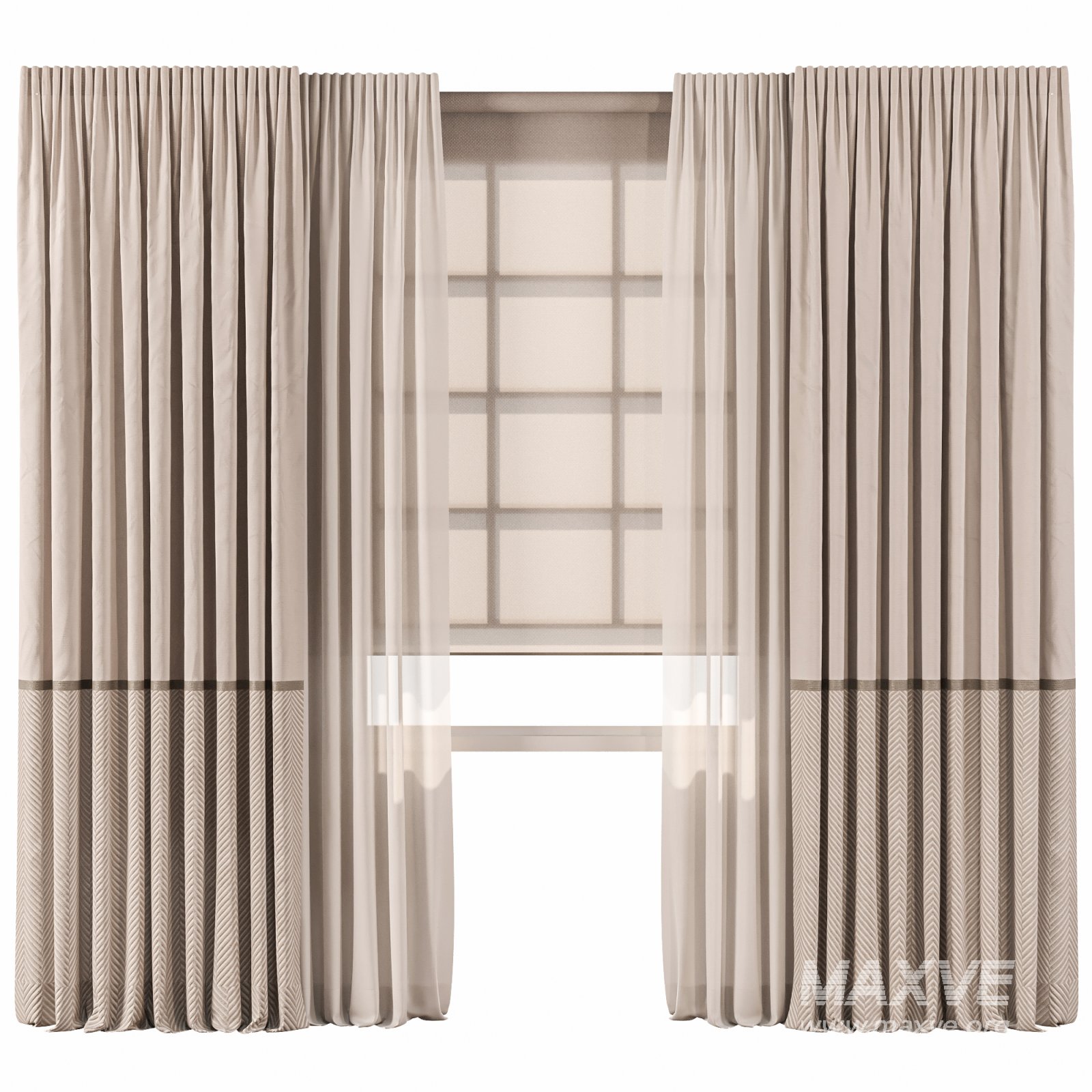 High-quality 3D model of double layer curtains made of soft beige linen fabric with a subtle herringbone pattern at the bottom. The combination of elegant heavy drapes and a light sheer layer creates a balanced and timeless look, suitable for modern living rooms, bedrooms, or contemporary interiors. Realistic folds, fine detailing, and high-resolution textures ensure a photorealistic result in any render.