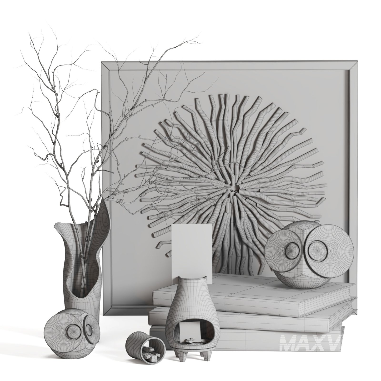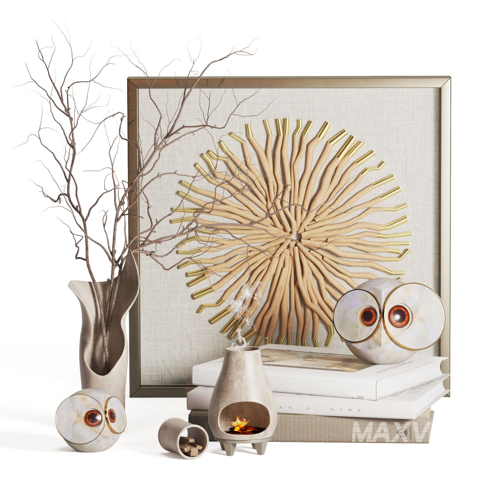 This set includes a beautifully rendered aromatic candle, a big-eyed owl, an elegant arrangement of books, a stylish vase with intricate details, and a decorative frame to showcase your favorite memories or artwork. Perfect for enhancing interior scenes, such as living rooms, bedrooms, or home offices, this versatile set effortlessly elevates the ambiance with its timeless appeal.