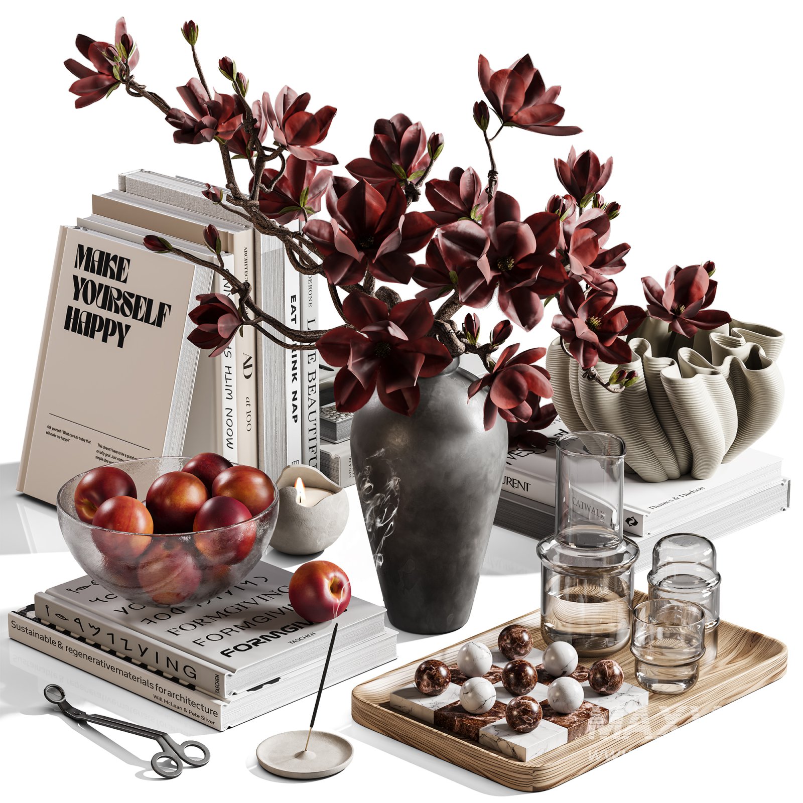 A richly detailed tabletop composition centered around a dramatic arrangement of deep burgundy magnolia blossoms in a moody gray vase, surrounded by curated modern lifestyle objects. This still life offers an elevated sense of quiet luxury and is perfect for contemporary architectural scenes, interior renderings, editorial vignettes, or product visualizations that require a warm, natural, yet design-forward atmosphere.