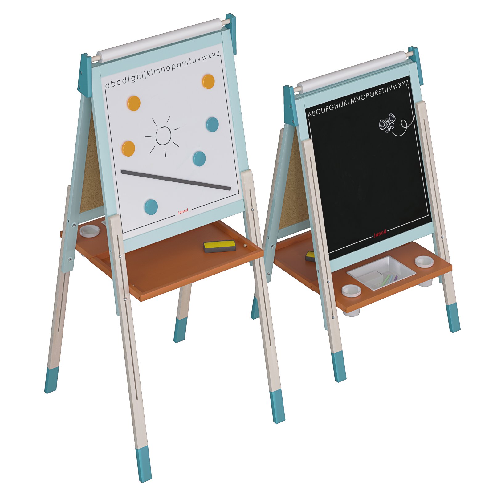 Adjustable Janod easel with magnetic and chalk board.