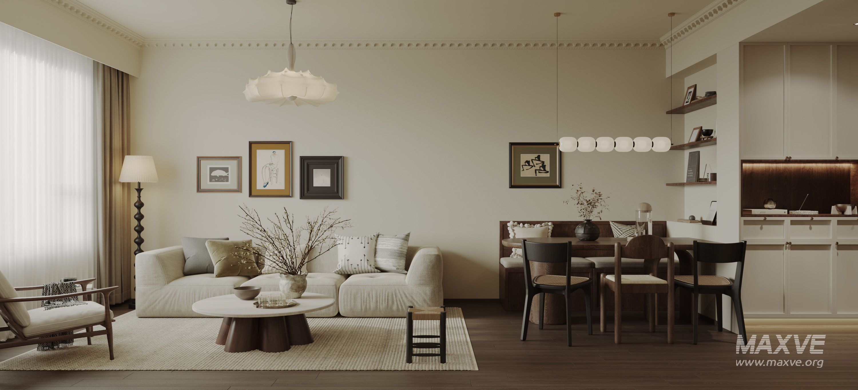 This Modern Eclectic living and dining room 3D scene was built in 3ds Max 2021 and rendered using Corona. It includes clean geometry, proper scene organization, and is optimized for smooth rendering performance. The model setup follows standard practices, making it easy to import and adapt into a variety of workflows. Delivered in MAX format, it is well-suited for architectural visualization, concept development, or design presentation. Dominant color tones include: White tones, Beige tones, Silver tones.