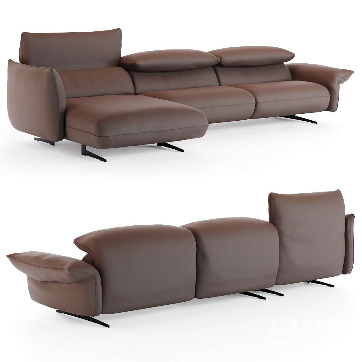 Exeter is a modern sofa with an adjustable headrest, featuring a reclining backrest that increases the feeling of comfort in moments of relaxation. The backrest is equipped with a chain mechanism, which allows each cushion to be independently folded inward with a few simple gestures, resulting in a dual style of seating: a conversation sofa, low, ideal for positioning in the center of the room; or a resting sofa, high to comfortably rest your head in total relaxation.