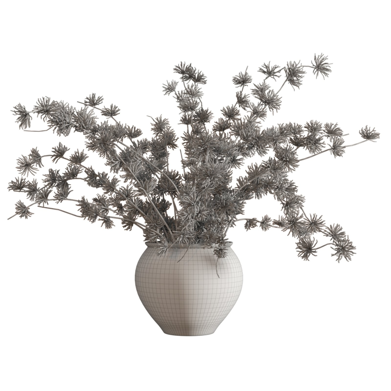 This 3D model features a natural dried plant arrangement displayed in a round rustic ceramic vase with a vintage finish. The foliage consists of delicate, spiky leaves and stems in warm earthy tones, making it ideal for boho, rustic, or modern interior visualizations. Perfectly crafted for 3ds Max, V-Ray, and Corona render engines, this asset adds a realistic and stylish decorative touch to any architectural rendering or interior design project.