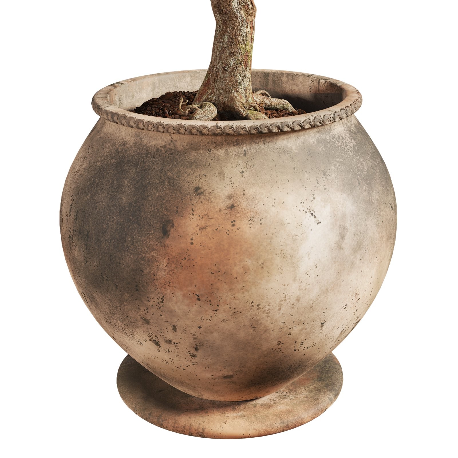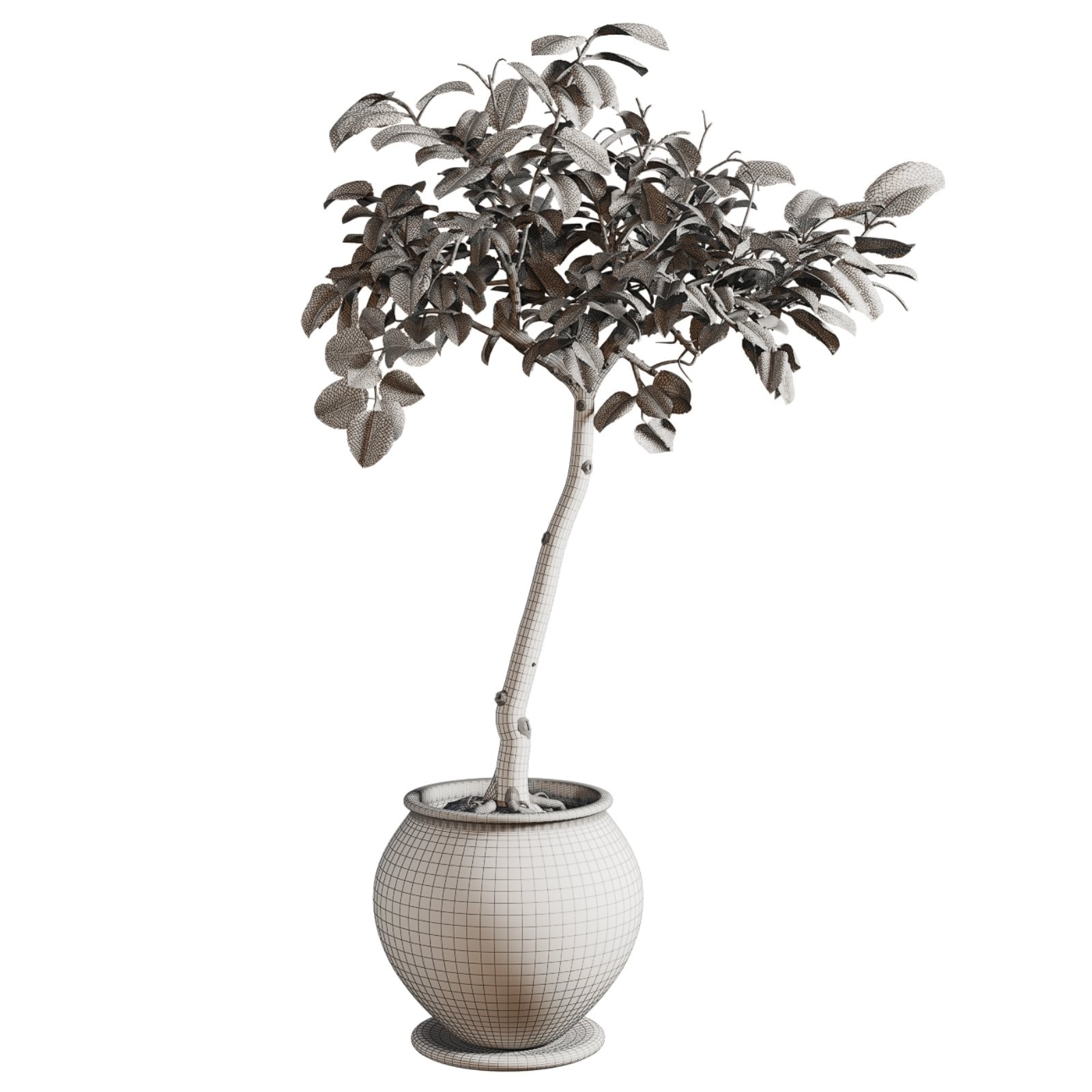 This high-quality 3D model showcases a realistic indoor ficus tree with vibrant green leaves and a naturally shaped trunk. The plant sits in a handcrafted aged terracotta pot with a rounded body and subtle decorative lip. The pot texture was carefully developed in Substance Painter, giving it a realistic worn and weathered ceramic finish with earthy color tones, ideal for rustic, wabi-sabi, or natural-styled interiors.