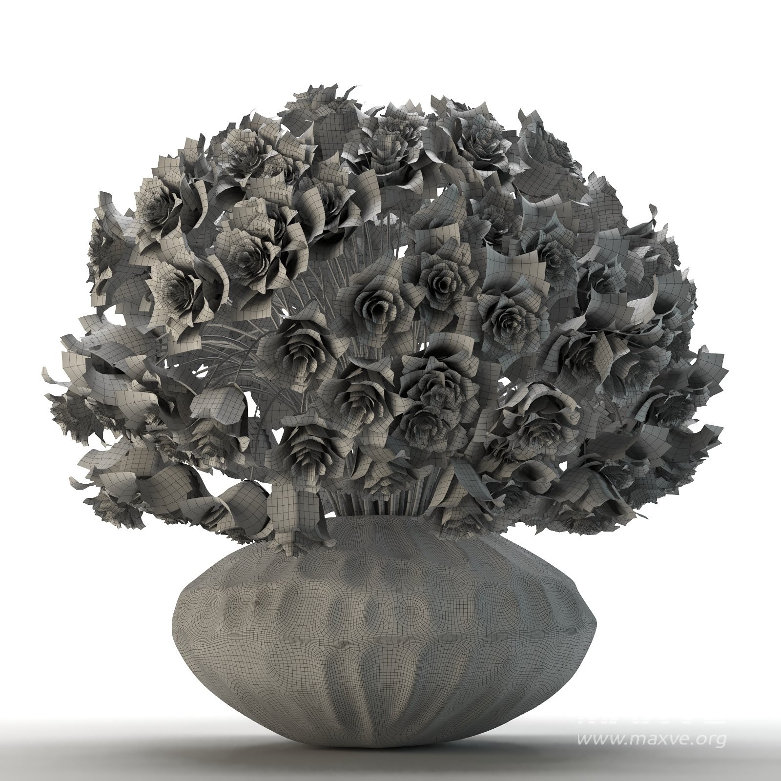 This high-quality 3D model features a luxurious decorative rose flower arrangement placed inside an elegant stone-textured vase. Designed with attention to detail, every rose petal and leaf has been sculpted to give a natural organic feel, providing a realistic and visually rich aesthetic suitable for close-up renders.
