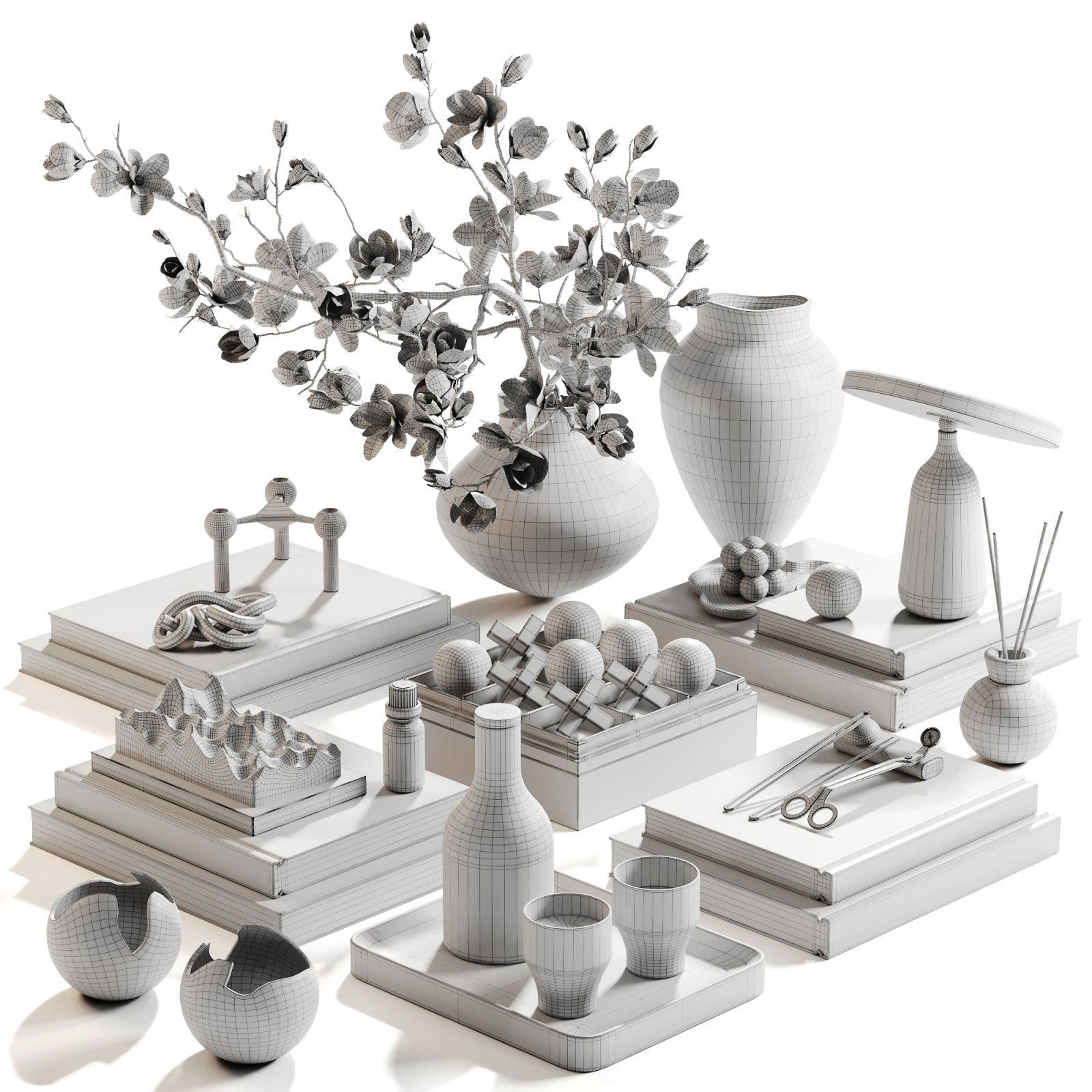 This premium 3D model features an artfully composed tabletop styling set centered around blooming magnolia branches. The arrangement brings together ceramic, wood, marble, and glass elements in a warm, neutral palette of ivory, beige, and soft gold—creating a mood of calm sophistication.