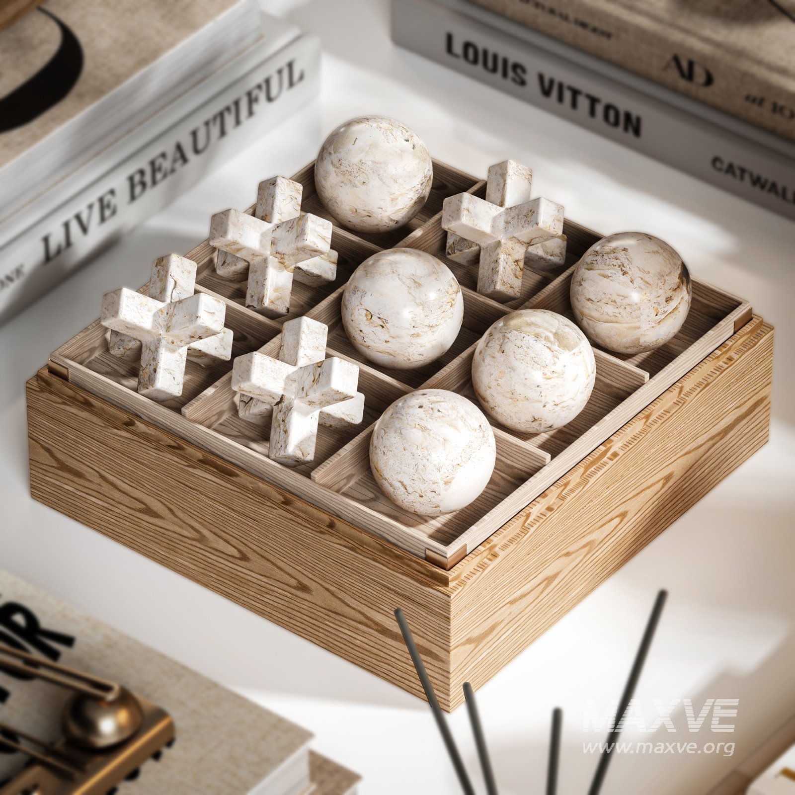 - A modern wooden tic-tac-toe set with marble spheres