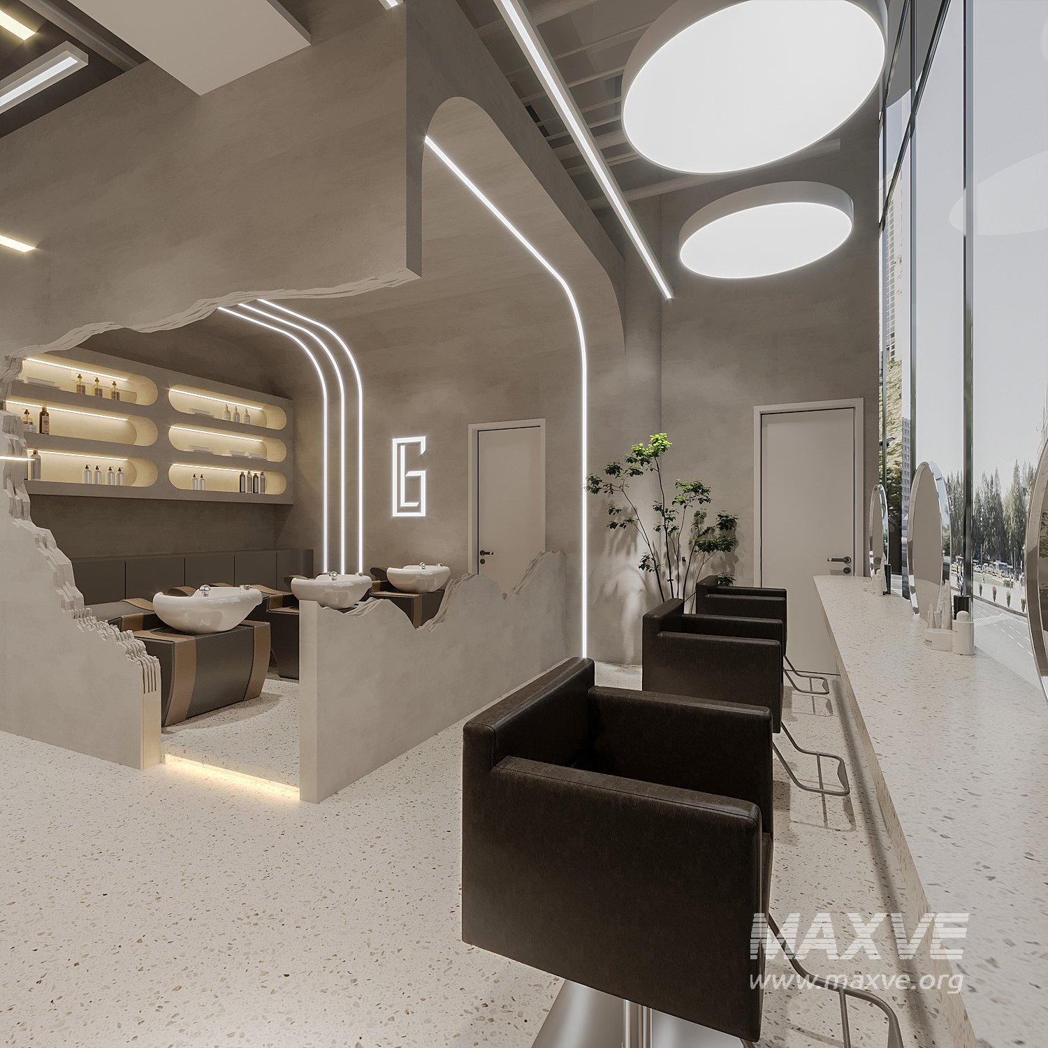 This Modern hair salon 3D scene was built in 3ds Max 2021 and rendered using Corona. It includes clean geometry, proper scene organization, and is optimized for smooth rendering performance. The model setup follows standard practices, making it easy to import and adapt into a variety of workflows. Delivered in MAX format, it is well-suited for architectural visualization, concept development, or design presentation. Dominant color tones include: White tones, Beige tones, Gray tones.