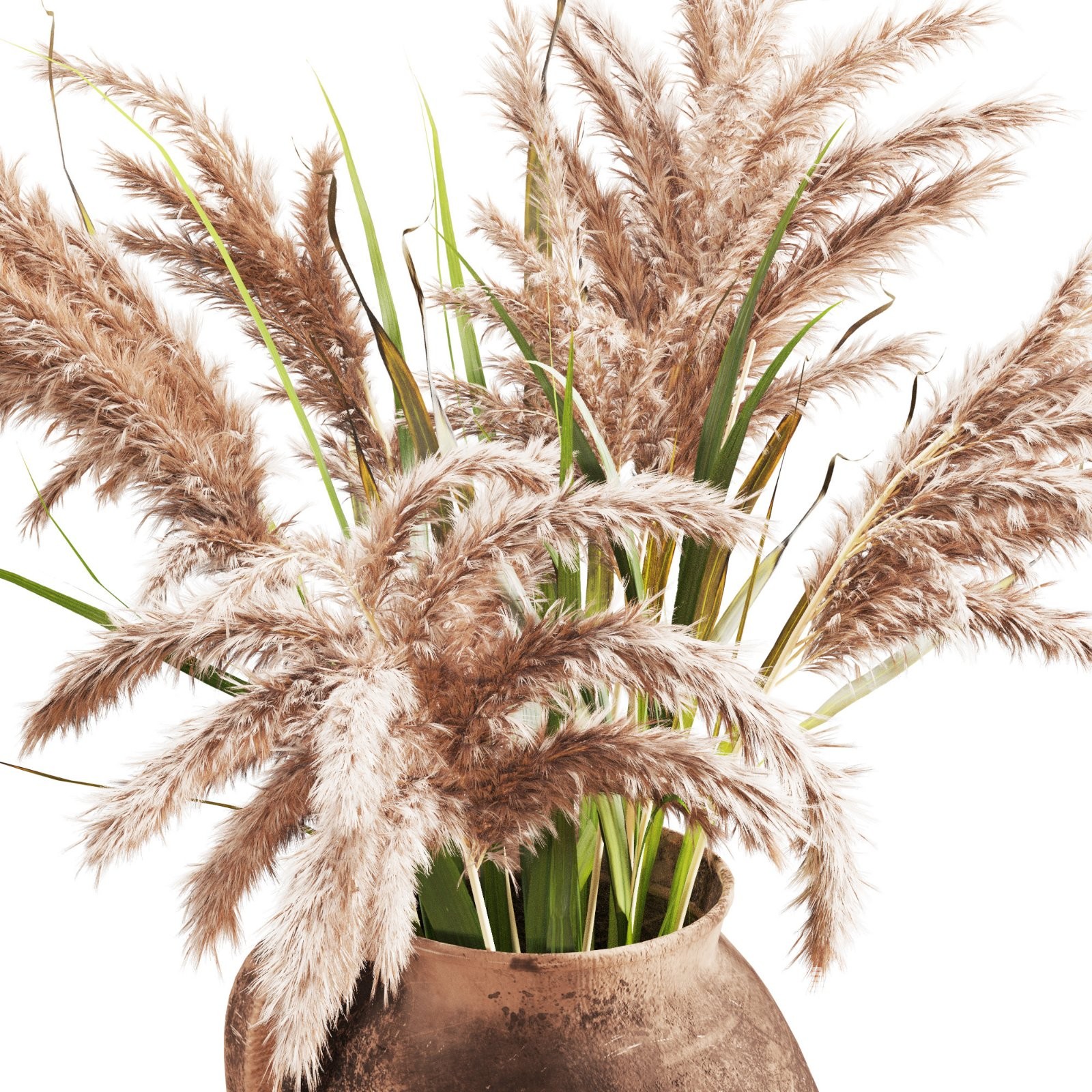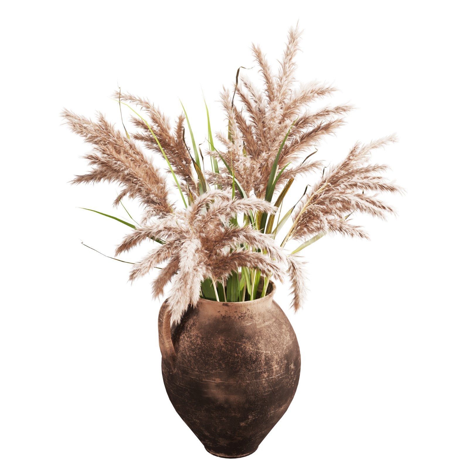 This high-quality 3D model features a rustic clay pot with a single side handle, showcasing a naturally aged, weathered surface texture. The earthenware finish reveals subtle imperfections, scratches, and tonal variations that replicate authentic handmade pottery. The pot is paired with a lush arrangement of dried pampas grass, adding organic volume and softness to the composition.