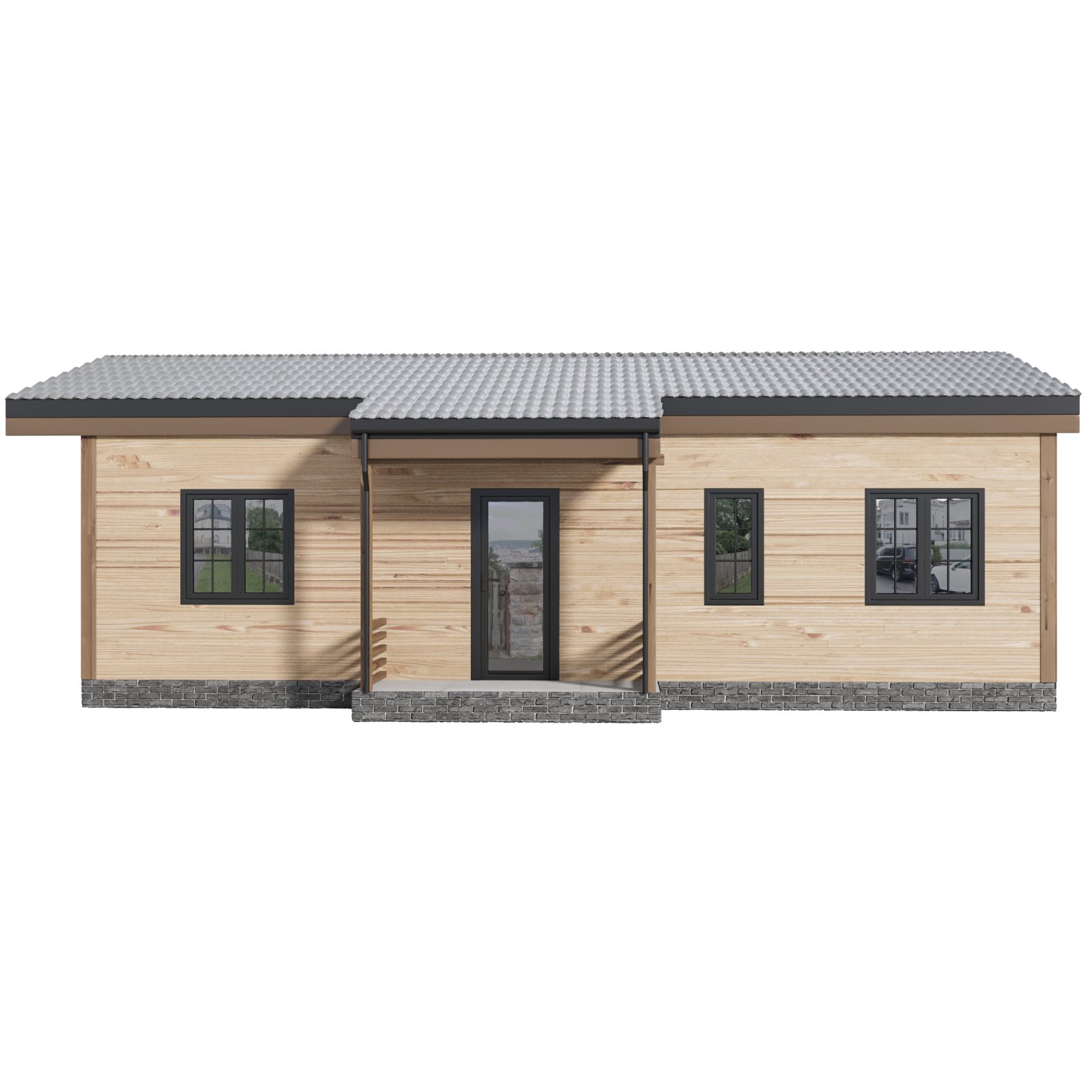 Description: A modern single-story home with a low-pitched gable roof and spacious wraparound veranda. The exterior features clean horizontal wooden siding, stone-clad foundation, and dark framed windows for a sleek, functional look. Perfect for minimalist, Scandinavian, or eco-friendly architectural styles, this model is optimized for photorealistic renderings and architectural visualizations.