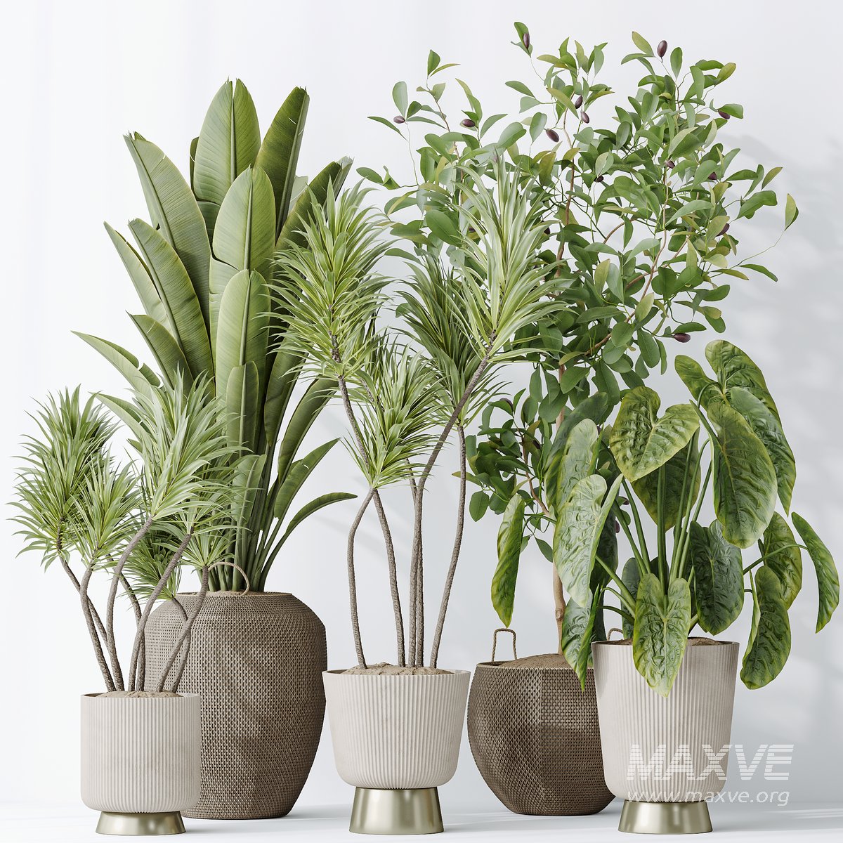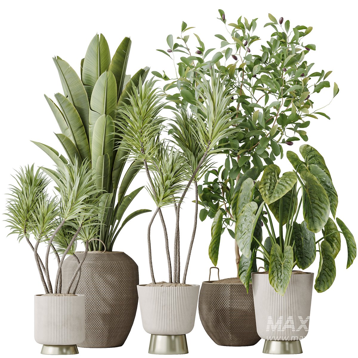 Indoor plants set 114 Spineless Yucca and Ravenala Banana Strelitzia and Briful Pachira and Cunjevoi Alocasia Jardin