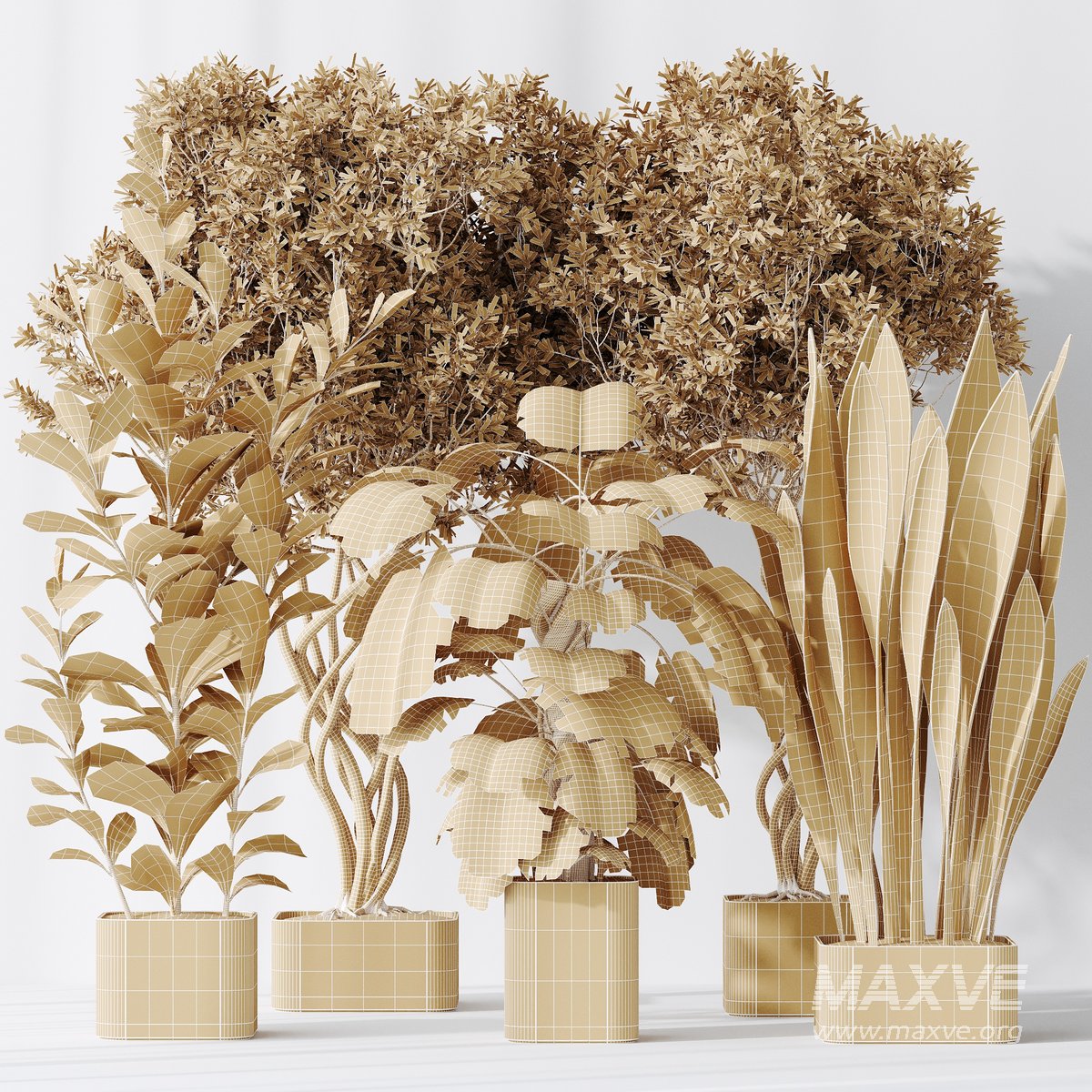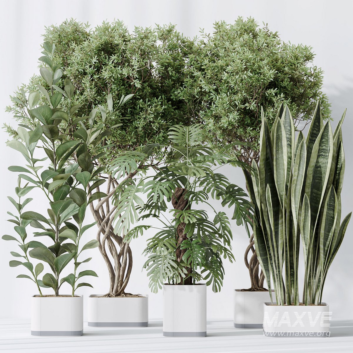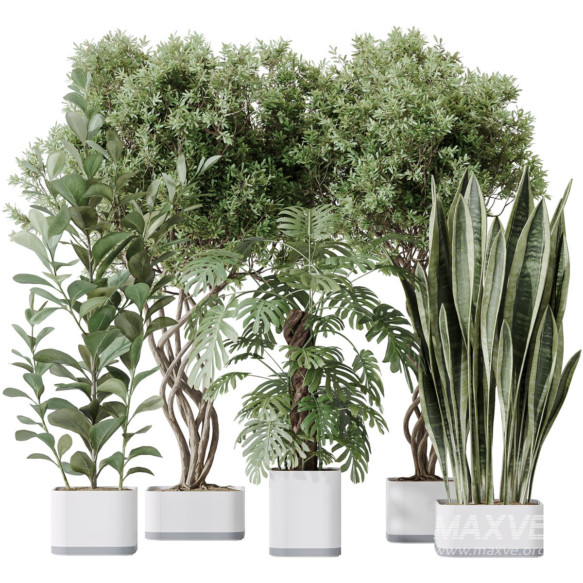 Indoor plants set 91 Green Sansevieria and Elegant Monstera and Ficus Microcarpa and Chemlali Olive