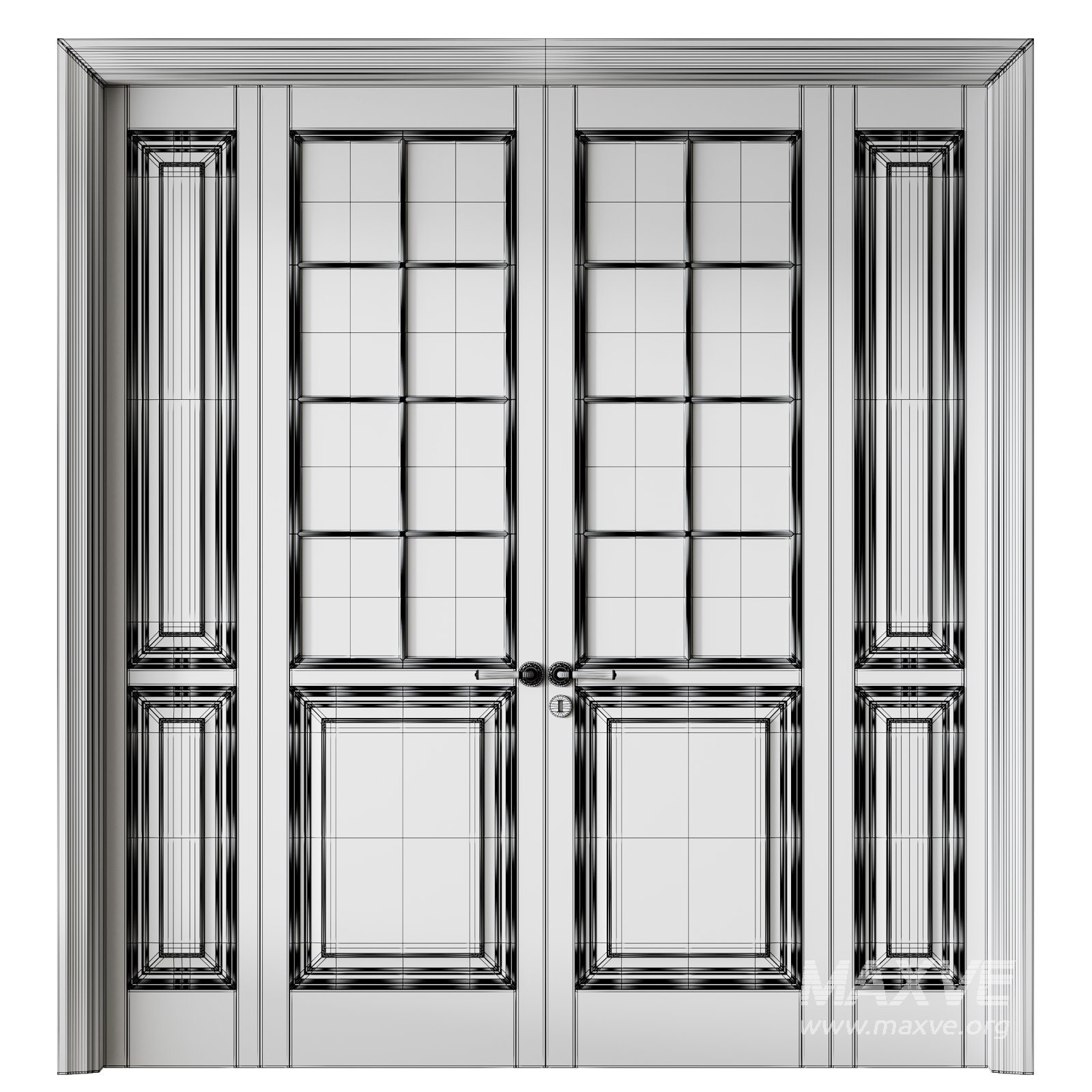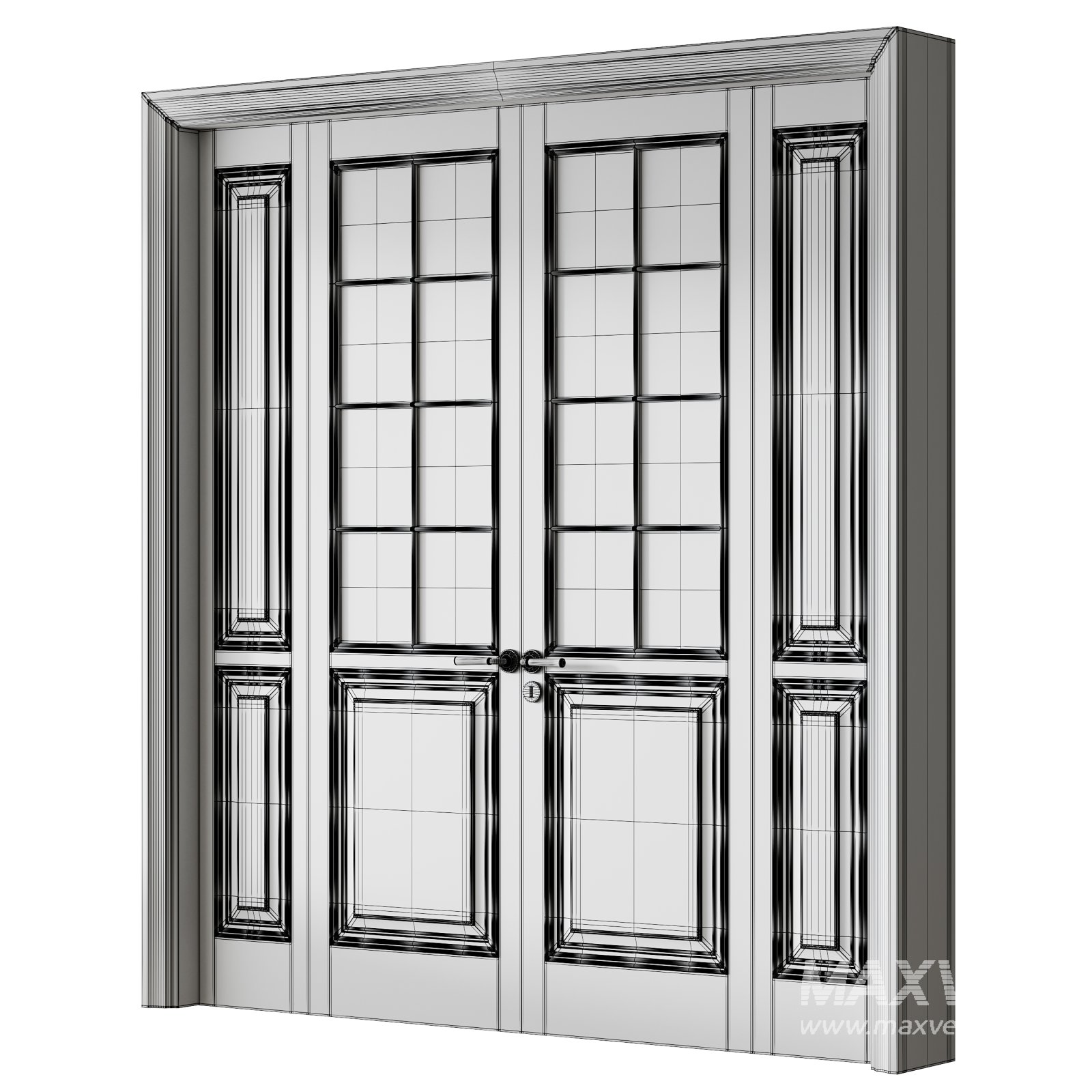 Description: Premium interior door set with a wide frame and ribbed glass inserts, designed for upscale modern spaces. Its precise geometry, detailed materials, and realistic proportions make it ideal for close-up renders and architectural visualization projects. Perfect for creating elegant room transitions in luxury homes, offices, or showrooms.