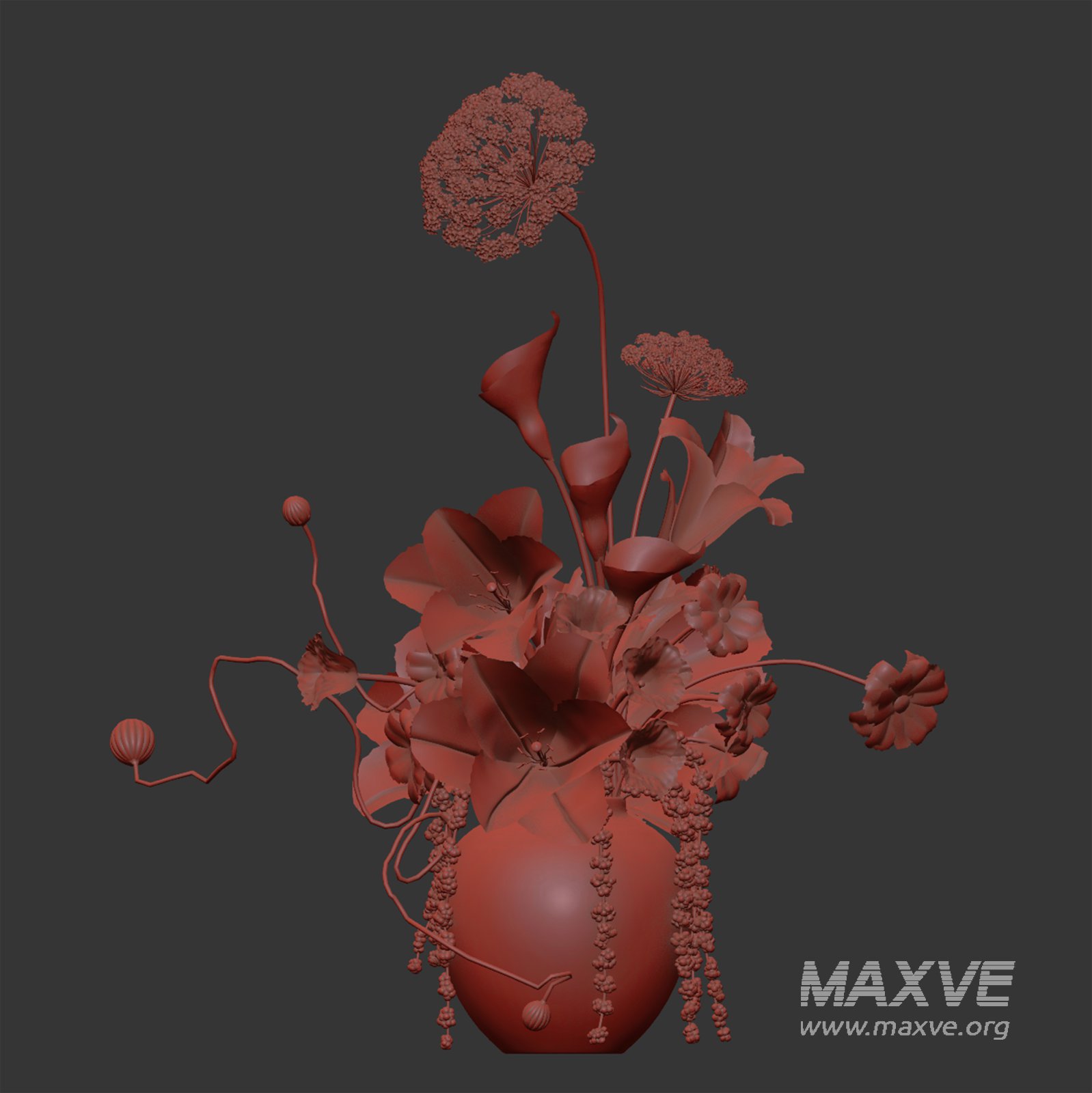 Each flower and foliage element is modeled as a single stem, giving maximum flexibility—use them as a complete arrangement or reconfigure for your own creative designs. The neutral stone-textured vase anchors the bouquet with a minimalist and timeless touch.