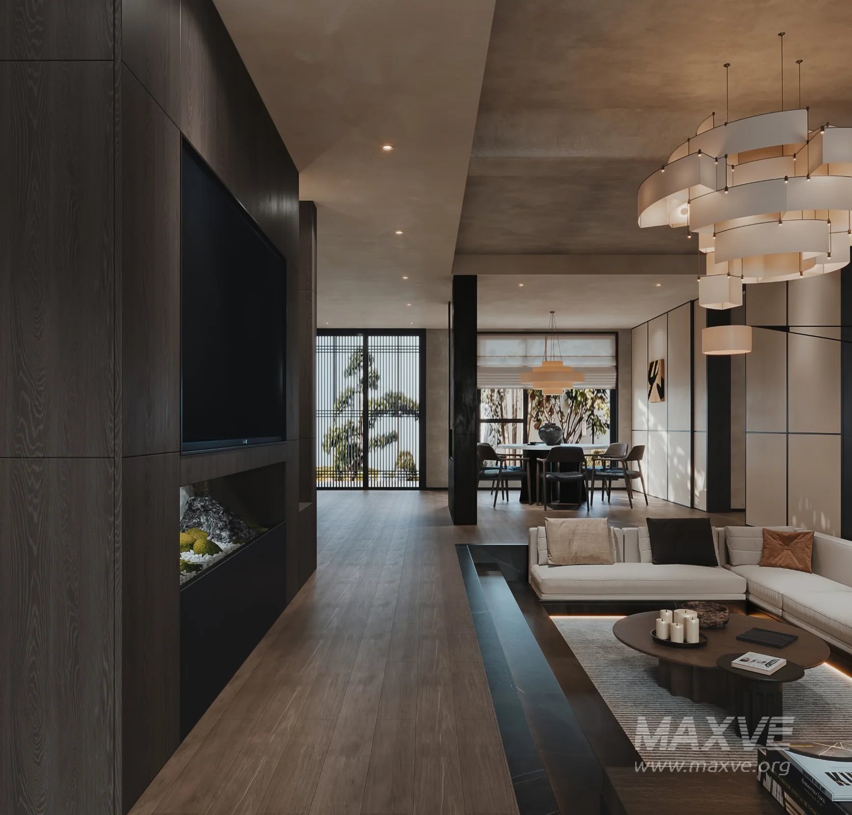 This Modern Japanese Living Room Dining Room 3D scene was built in 3ds Max 2021 and rendered using Corona. It includes clean geometry, proper scene organization, and is optimized for smooth rendering performance. The model setup follows standard practices, making it easy to import and adapt into a variety of workflows. Delivered in MAX format, it is well-suited for architectural visualization, concept development, or design presentation. Dominant color tones include: White tones, Beige tones, Gray tones.