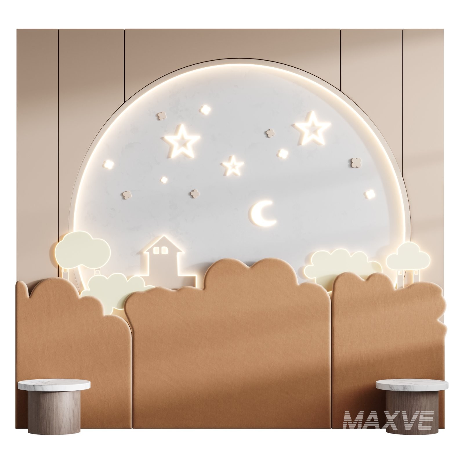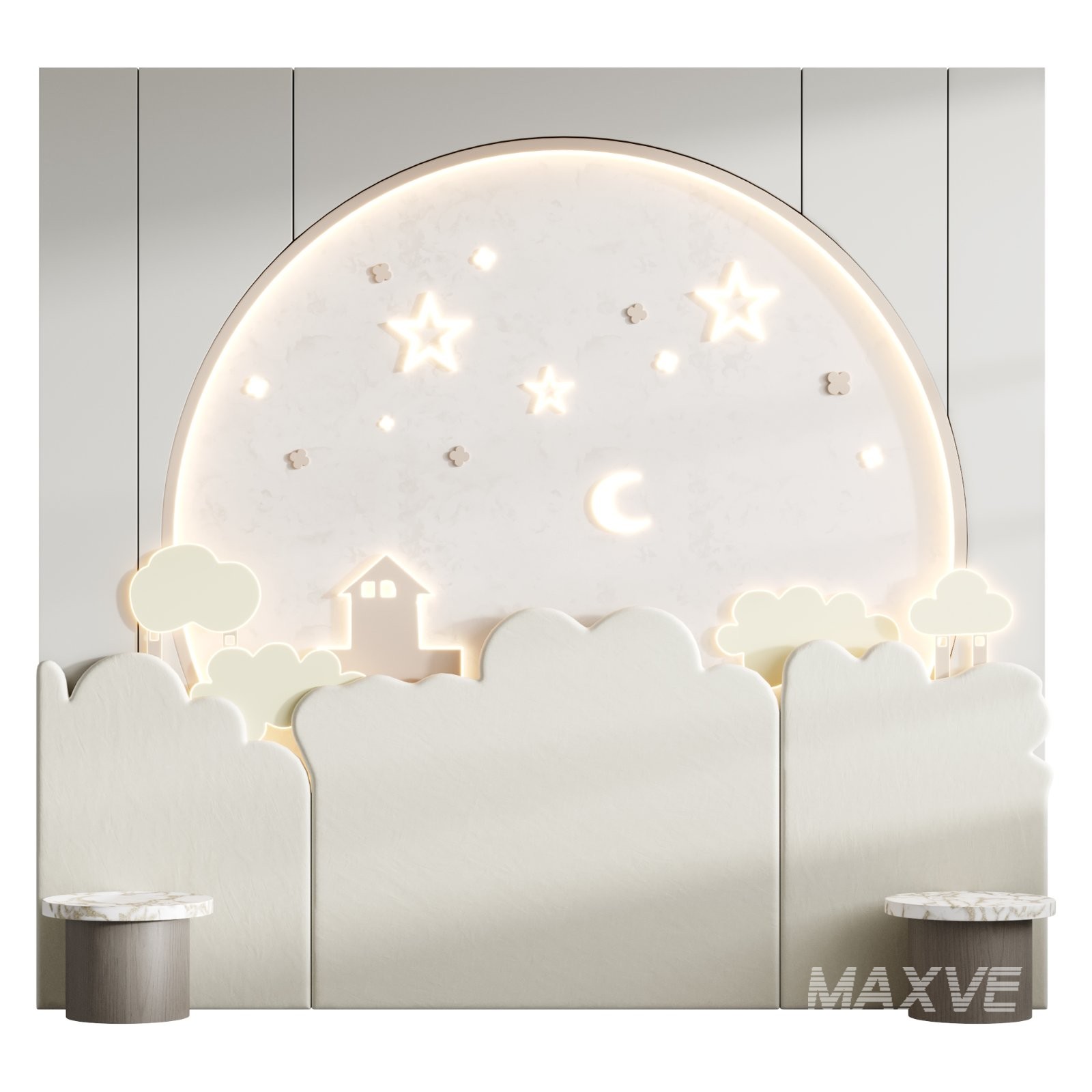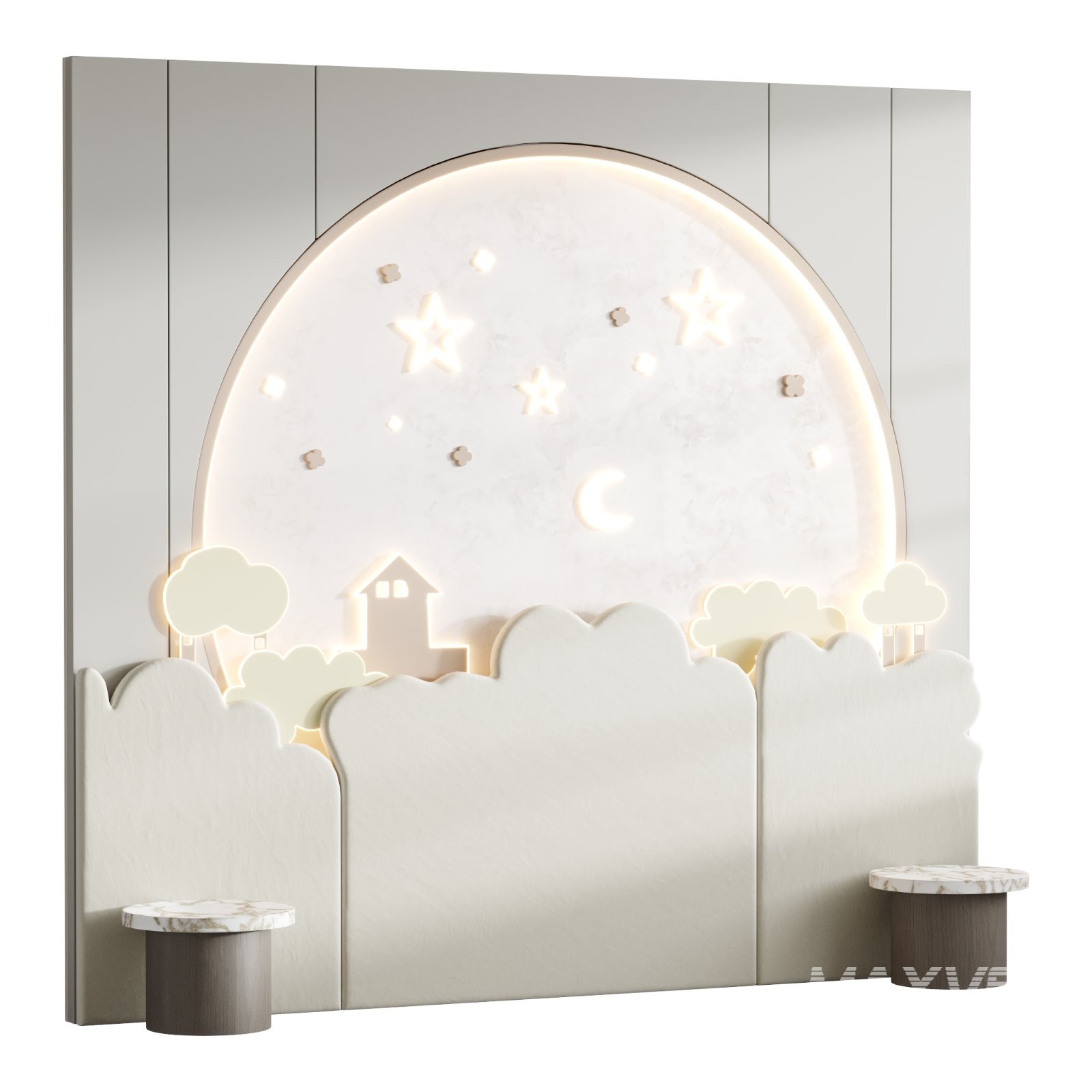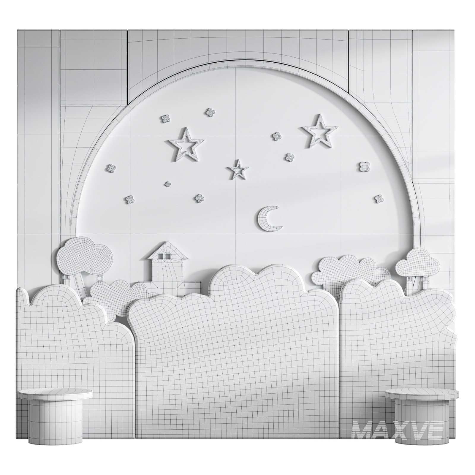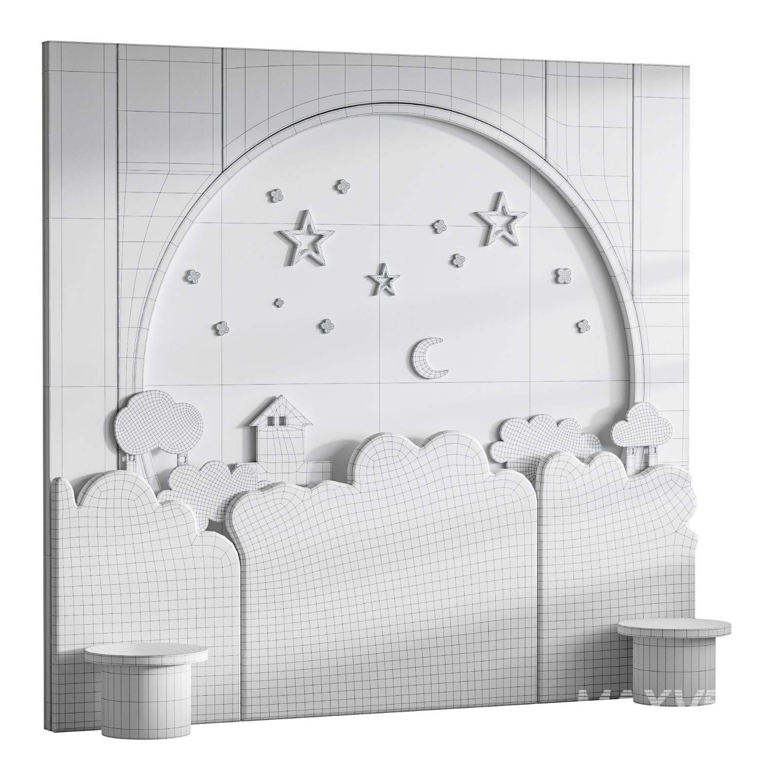 Description: 3D model of a kids’ wall panel with playful design and detailed geometry. Optimized for Corona and V-Ray, ideal for interior visualizations of children’s rooms and modern décor projects.